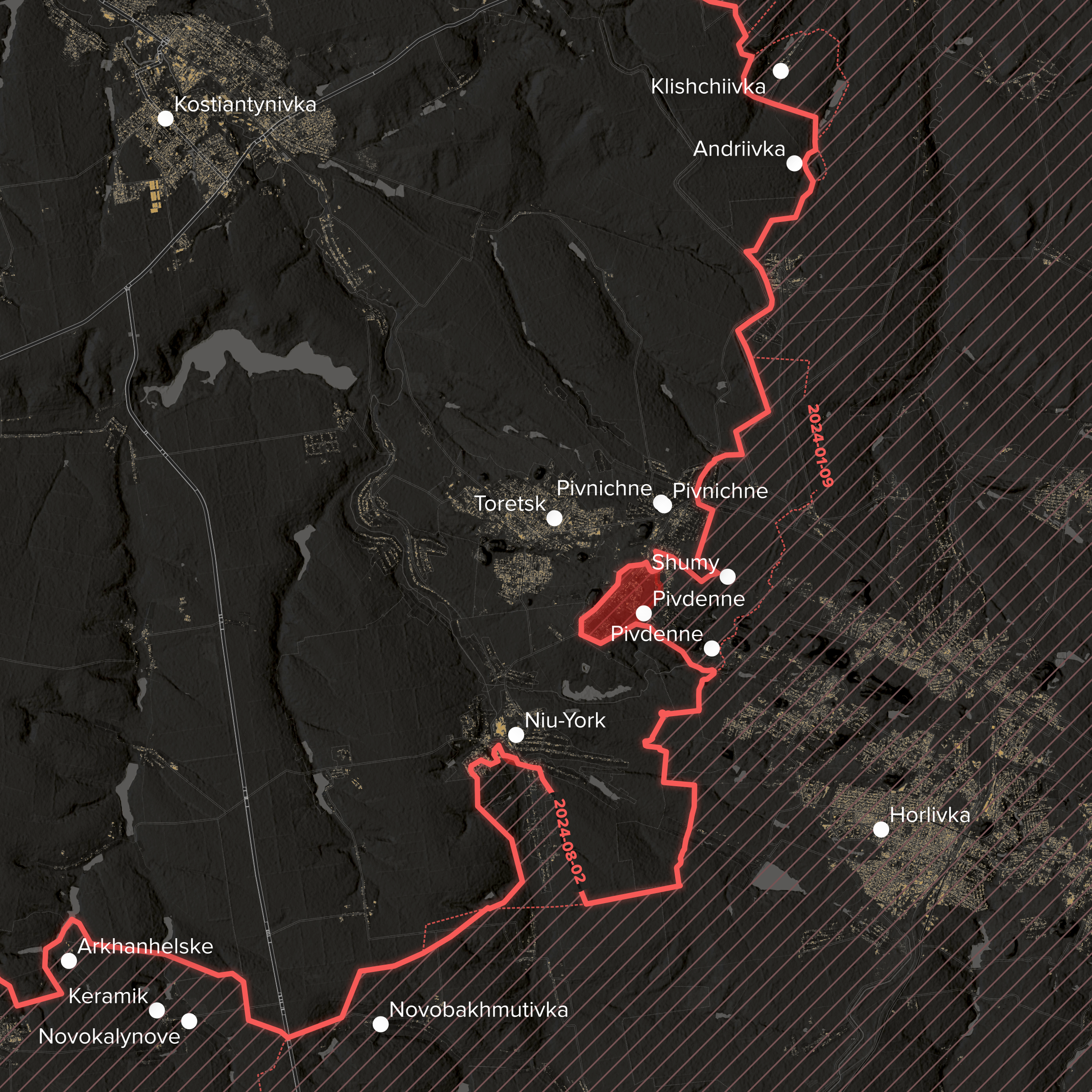 Additionally, despite moving in reserves, the Ukrainian army continues to lose positions in the villages of Niu-York and Zalizne in the Toretsk urban area. The troops between these villages are already at risk of being encircled. Furthermore, the Russian army has managed to cross the Siverskyi Donets–Donbas Canal in Chasiv Yar and establish a small bridgehead on its western bank. Reinforcing positions around Pokrovsk, Toretsk, and Chasiv Yar is difficult for Ukraine as defense crises are also brewing in other areas, particularly in southern Donbas.
