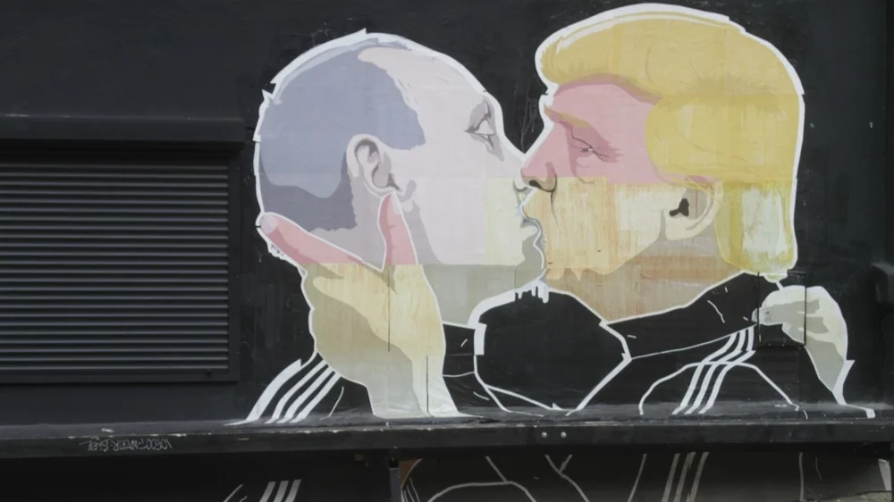 A mural by Lithuanian artist Mindaugas Bonanu depicting former US President Donald Trump kissing Vladimir Putin. Vilnius, Lithuania, 04 August 2016. EPA/VALDA KALNINA
