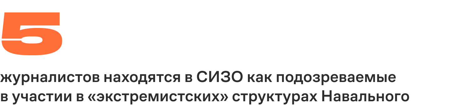 Как минимум пять журналистов находятся в СИЗО как подозреваемые в участии в «экстремистских» структурах Навального. В марте под арест отправили корреспондентку SOTA.vision Антонину Фаворскую (Москва) и журналистку издания RusNews Ольгу Комлеву (Уфа), позднее стало известно о заключении под стражу сотрудничавшего с Associated Press и Deutsche Welle Константина Габова (Москва) и журналиста Сергея Карелина (Мурманск). В середине июня в Москве после обыска арестовали коллегу Фаворской Артема Кригера.