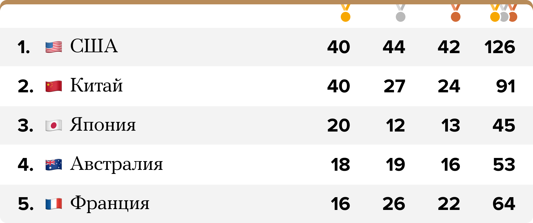 США в последний день Олимпиады сравнялись с Китаем по золотым медалям благодаря женской баскетбольной сборной, выигравшей в финальном матче у Франции. У обеих стран в итоге по 40 золотых медалей, но у США гораздо больше серебра и в общем зачете они поднялись на первое место. У россиян, выступавших под нейтральным флагом, по итогам Олимпиады только одна медаль — серебро в парном женском теннисе у Мирры Андреевой и Дианы Шнайдер. Украина завершила выступление на Олимпиаде с 12 медалями: три золотых, пять серебряных, четыре бронзовых. Это лучший результат страны по золотым медалям за 12 лет на Олимпийских играх. Из стран бывшего СССР выше всех оказался Узбекистан с 13 медалями, из которых восемь золотых.
