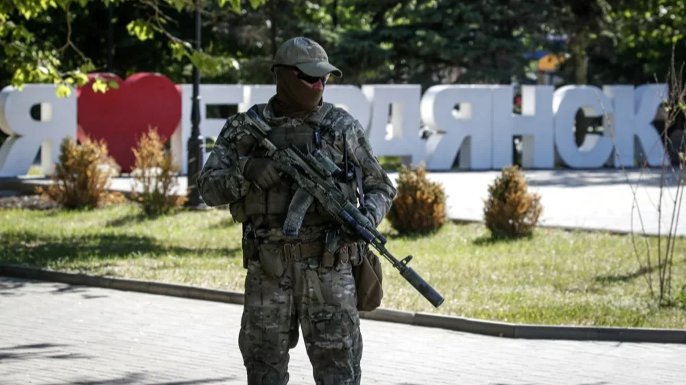 A Russian soldier on patrol in Berdyansk, in the Russian-occupied part of Ukraine’s Zaporizhzhia region. Photo: Sergey Ilnitsky / EPA-EFE