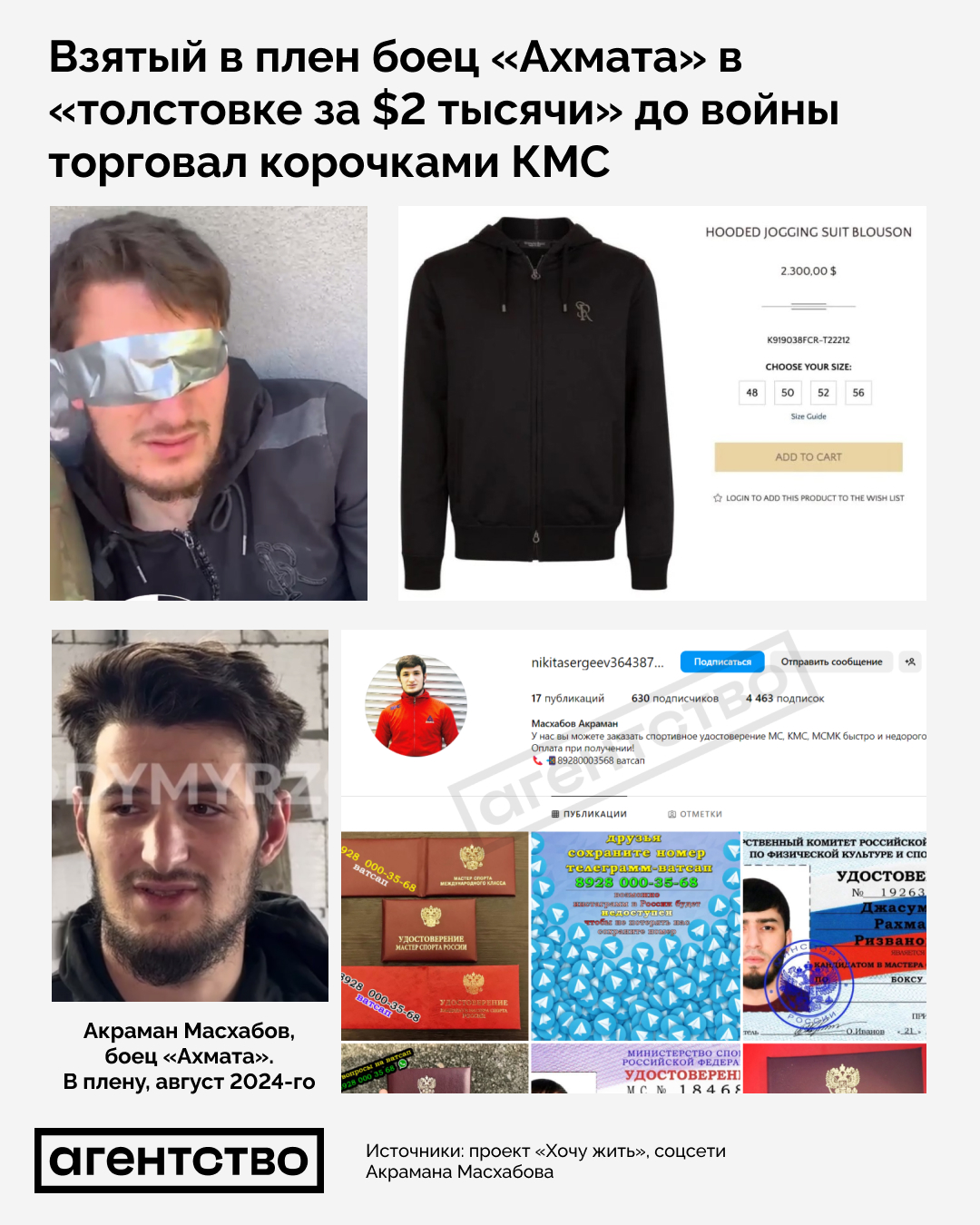 Украинский проект «Хочу жить» в четверг опубликовал видео с одним из бойцов чеченских подразделений, которого ВСУ во время наступления в Курскую область. Внимание пользователей соцсетей он привлек, потому что был одет в толстовку, похожую на модель бренда Stefano Ricci стоимостью более 2 тысяч долларов. «Агентство» установило личность военного — это действительно боец подразделения «Ахмат», который, судя по его соцсетям, до войны торговал удостоверениями кандидатов в мастера спорта.