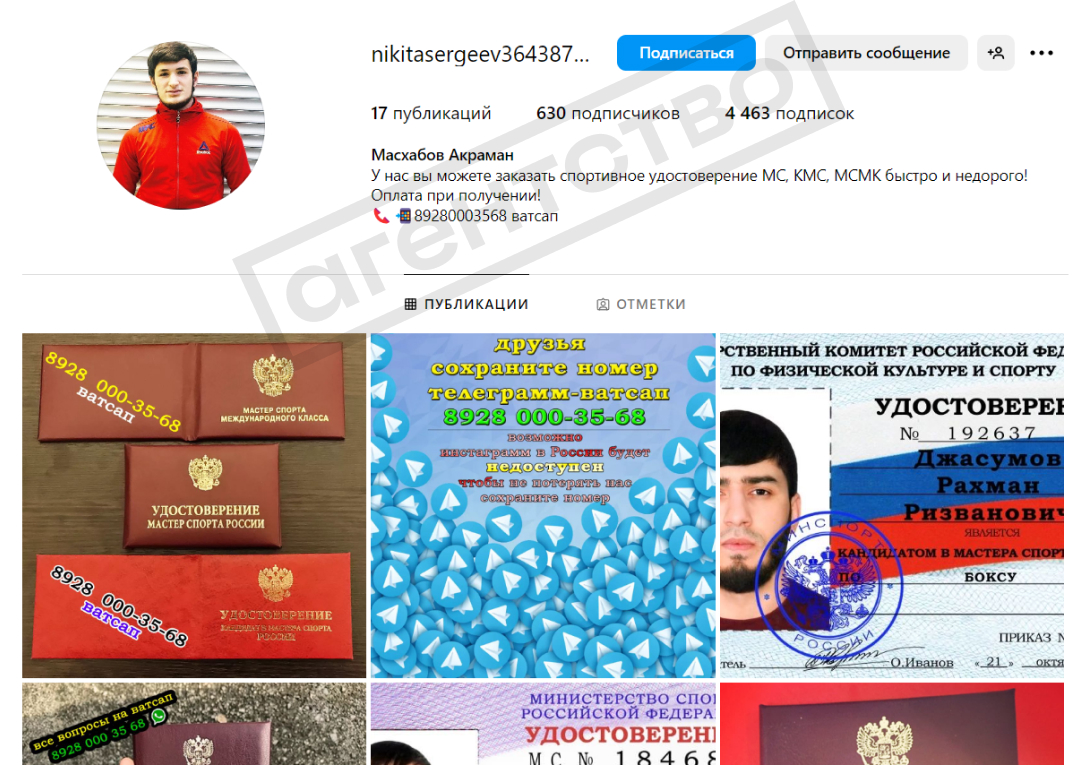 - Судя по странице Масхабова в Instagram, с января 2019-го по апрель 2022 года он, вероятно, торговал удостоверениями мастеров и кандидатов в мастера спорта. Рекламе этой услуги посвящено 16 из 17 его постов в соцсети.