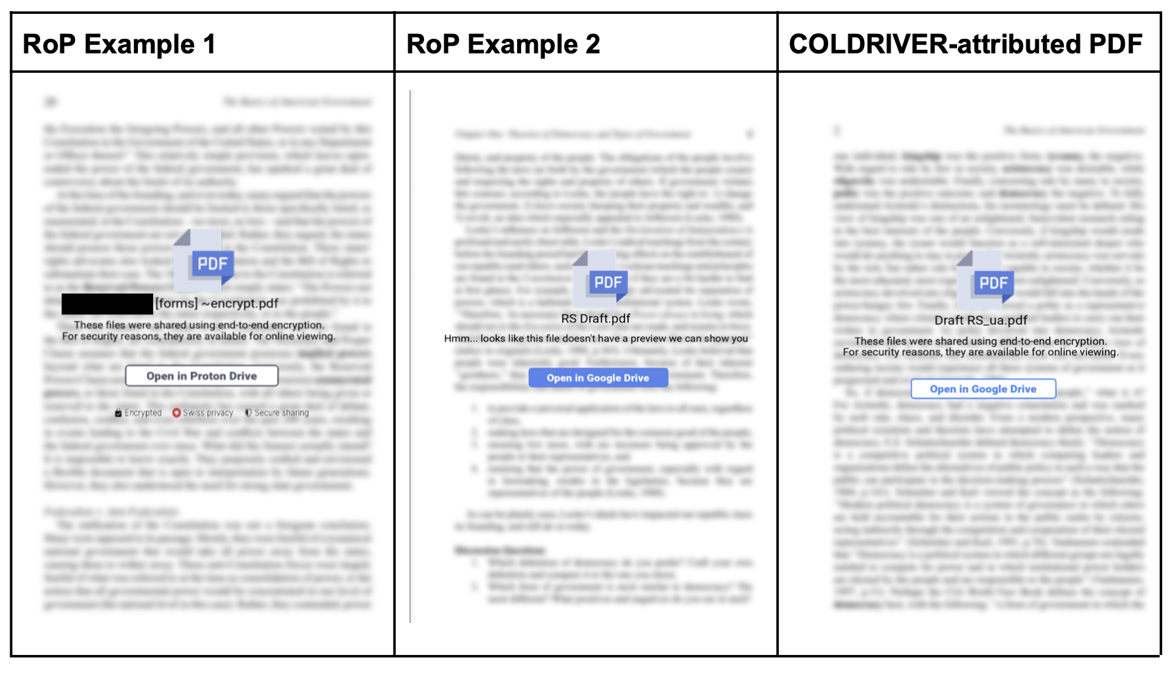 - Во втором случае сообщения создавалось специально под взламываемого пользователя. При этом учитывались данные, полученные об этом пользователе, в том числе, судя по всему, и из почтовых ящиков, к которым злоумышленники получили доступ ранее. В ходе переписки использовались различные практики социального инжиниринга: хакер мог «забывать» сразу прикрепить документ с фишинговой ссылкой, досылать ссылку на документ отдельно, долго не отвечать и т.д. При попытке открытия документа цель атаки видела уведомление о том, что документ невозможно открыть встроенными в почту расширениями Google Drive и Proton Drive, после чего жертве предлагали открыть якобы сайты этих сервисов (а на самом деле фишинговые страницы) и уже с их помощью происходило похищение личных данных.