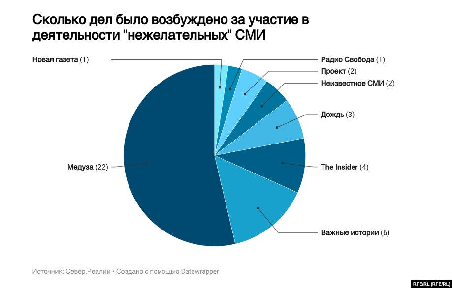 Среди медиа "лидером" по количеству протоколов о "нежелательности" стала "Медуза". Север.Реалии нашел 22 дела, связанных с этим изданием. 15 протоколов было составлено из-за публикации ссылок или комментариев, данных журналистам "Медузы". Еще 7 дел было возбуждено на журналистов, сотрудничающих с изданием.