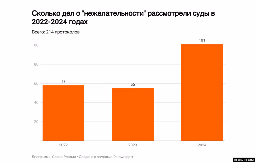 В России с начала 2022 года и до конца июля 2024 года суды поступило не менее 214 протоколов по административным делам о деятельности "нежелательных" организаций, подсчитал Север.Реалии. В 2022 и 2023 годах количество протоколов было примерно равным – 58 и 55 соответственно. Но только за первое полугодие 2024 года число дел выросло почти в два раза – до 101.