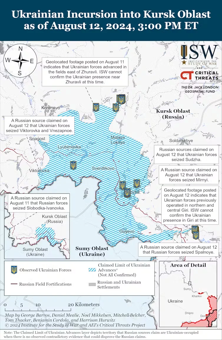 There have been reports of Ukrainian troops using mechanical diggers to build trenches inside Russia, which could indicate plans to try to defend at least some of the seized territory. Meanwhile, the Russians are doing similar, with a view to stabilising the lines. This will be their short-term goal, followed by the attrition of Ukrainian forces and the reducing of the pocket occupied by the incursion.