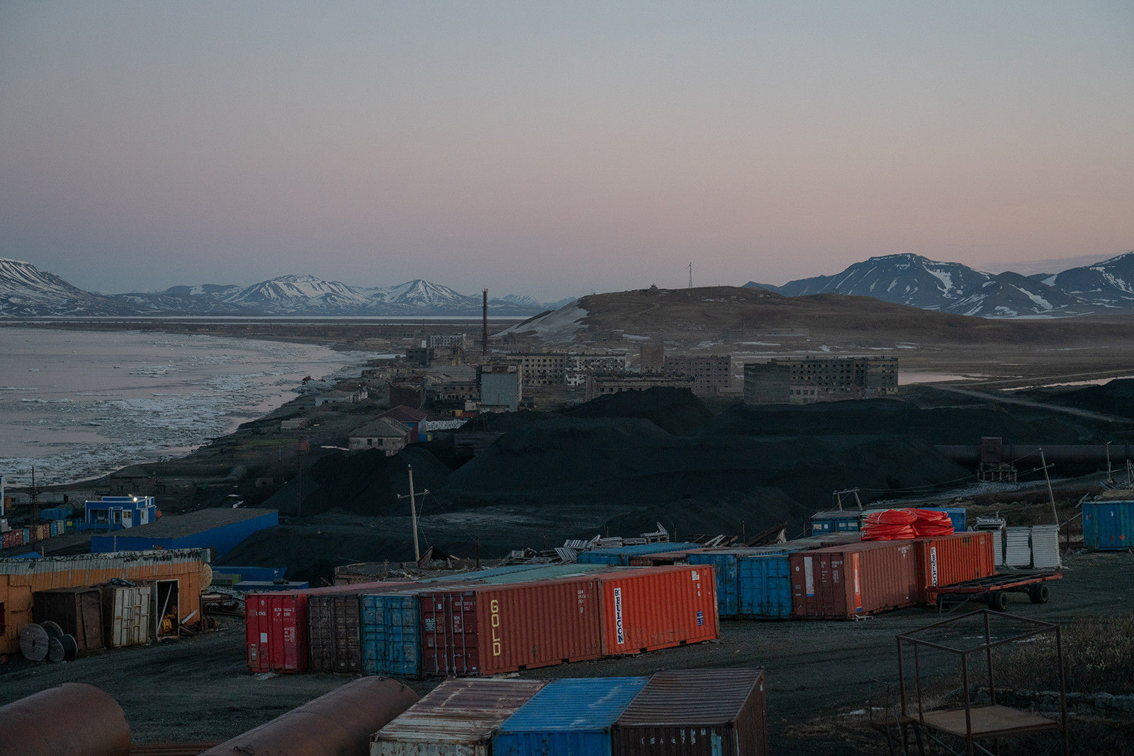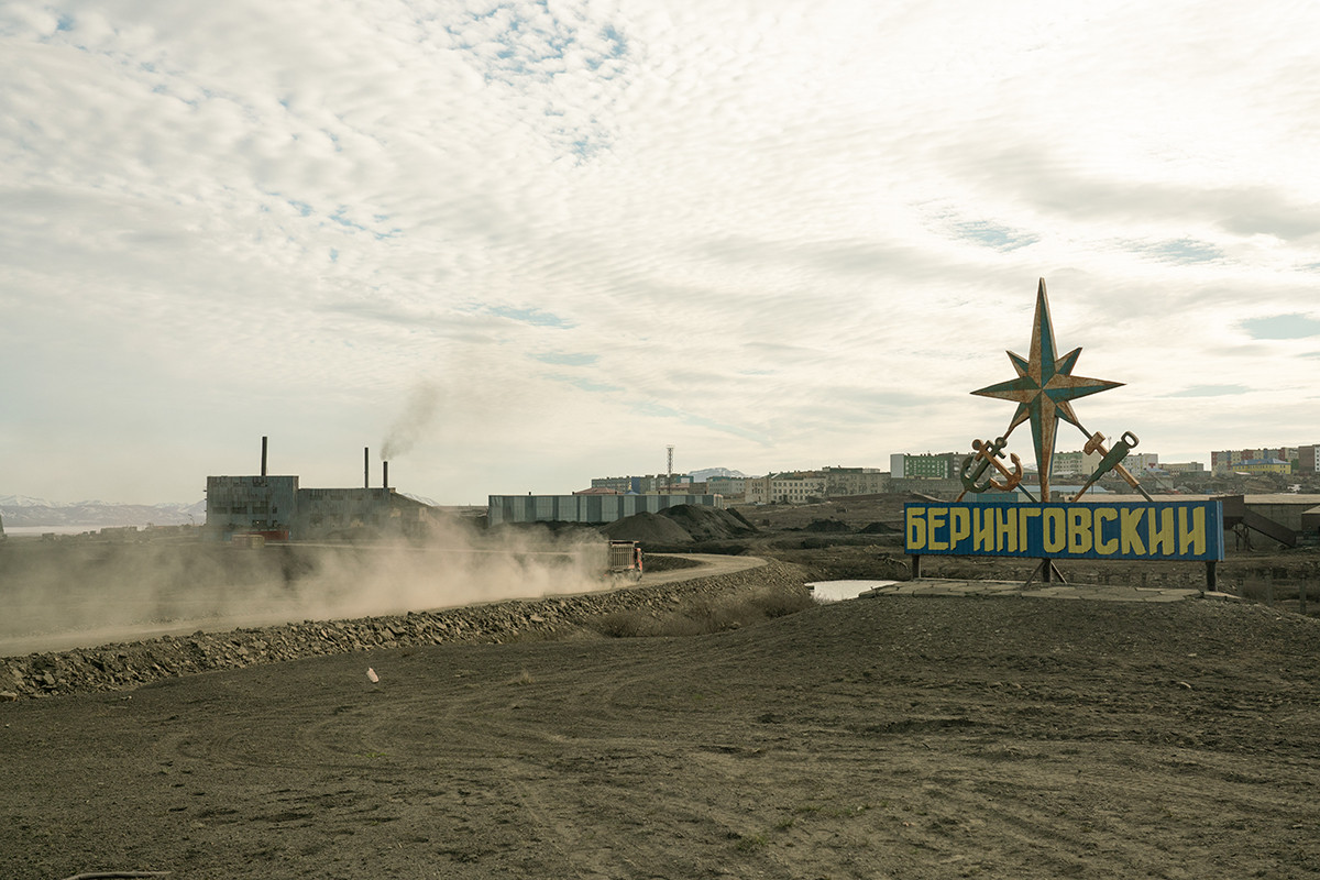 Горизонт закрывают сине-белые сопки, крики чаек тонут в жужжании машин — одни выгружают уголь, другие подвозят его к портовому причалу. Обернешься — за брошенными домами возвышаются ничем не прикрытые рукотворные черные горы. Смотришь под ноги — у самой кромки воды разбросана темная галька, которая на поверку оказывается углем. На внешнем рейде Угольной бухты стоит китайское судно, способное увезти до 100 000 тонн ископаемых за раз. К нему по очереди подходят российские пятисоттонные корабли-перегрузчики — иностранным судам заход в Беринговский порт запрещен.
