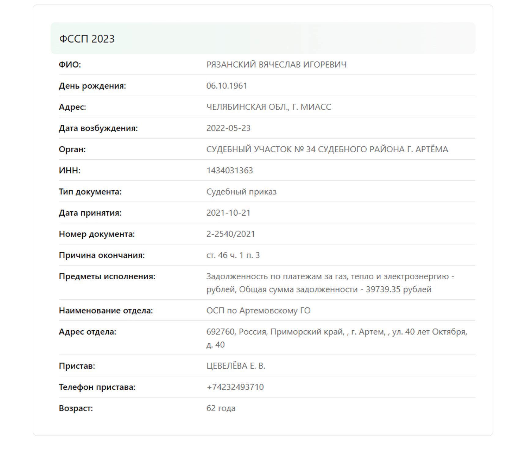 Служба судебных приставов по московскому району Лефортово прекратила исполнительное производство в отношении генерала ФСБ Вячеслава Рязанского, поскольку не смогла установить его домашний адрес, счета в банках и наличие имущества. The Insider выяснил, что с 2004 года у генерала имеется долг за коммунальные услуги в Приморском крае и неоплаченные автомобильные налоги. Между тем в Москве должник проживает в элитной квартире, оформленной на супругу, передвигается на дорогом внедорожнике и материально помогает храму в Южном Бутове, бóльшая часть прихожан которого — офицеры из военной контрразведки ФСБ.