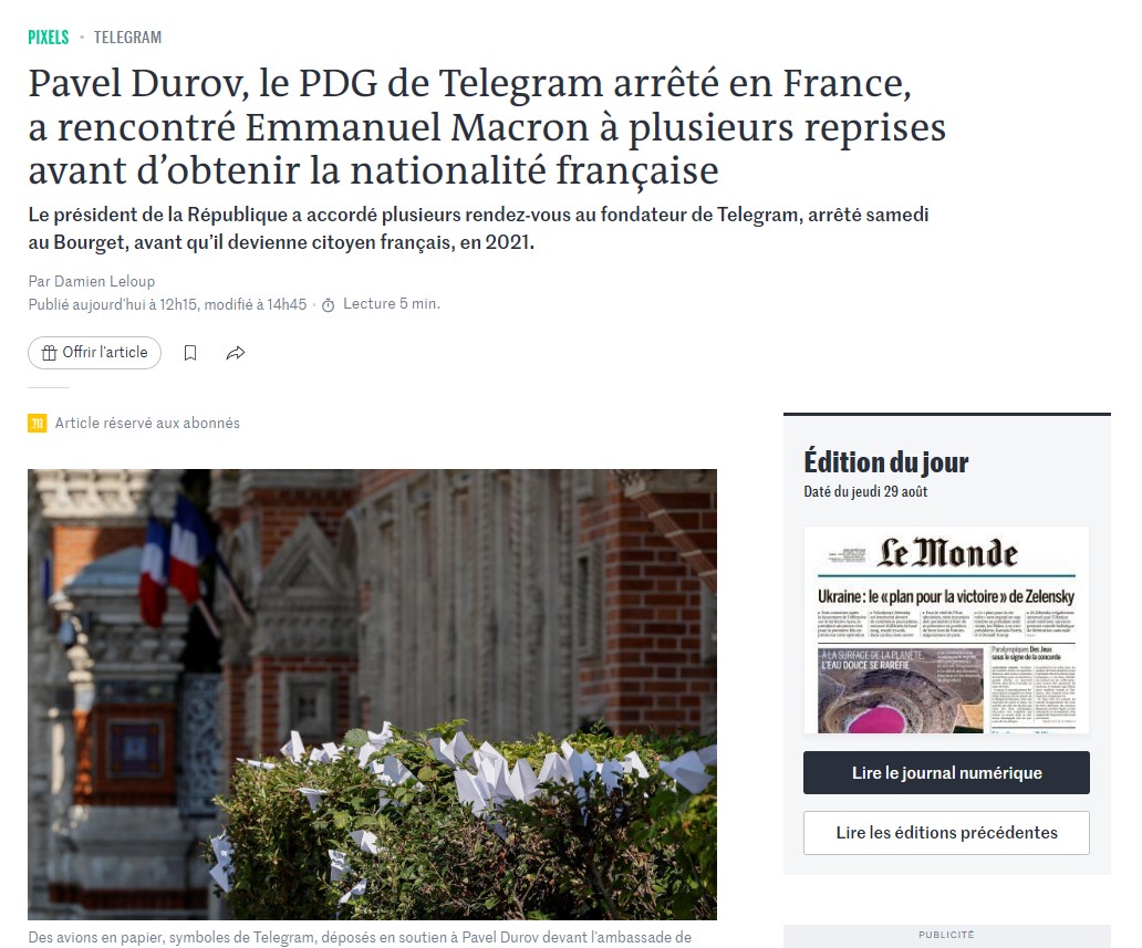 При предварительном рассмотрении запроса основателя Telegram о предоставлении гражданства ответственная за это служба французского МИДа посчитала, что условия для выдачи паспорта «выдающемуся гражданину» по предусмотренной для этого процедуре не были выполнены, пишет Le Monde. По данным издания, Дуров подтвердил владение французским языком, но также он должен был показать, что способствует повышению «влияния Франции». При этом в 2021 году, когда основатель Telegram получил паспорт Франции, в новостях он чаще упоминался в связи с критикой модерации в Telegram и отказами сотрудничать с европейскими властями. Кроме того, он критиковал французские власти после терактов в Париже и Сен-Дени в 2015 году.