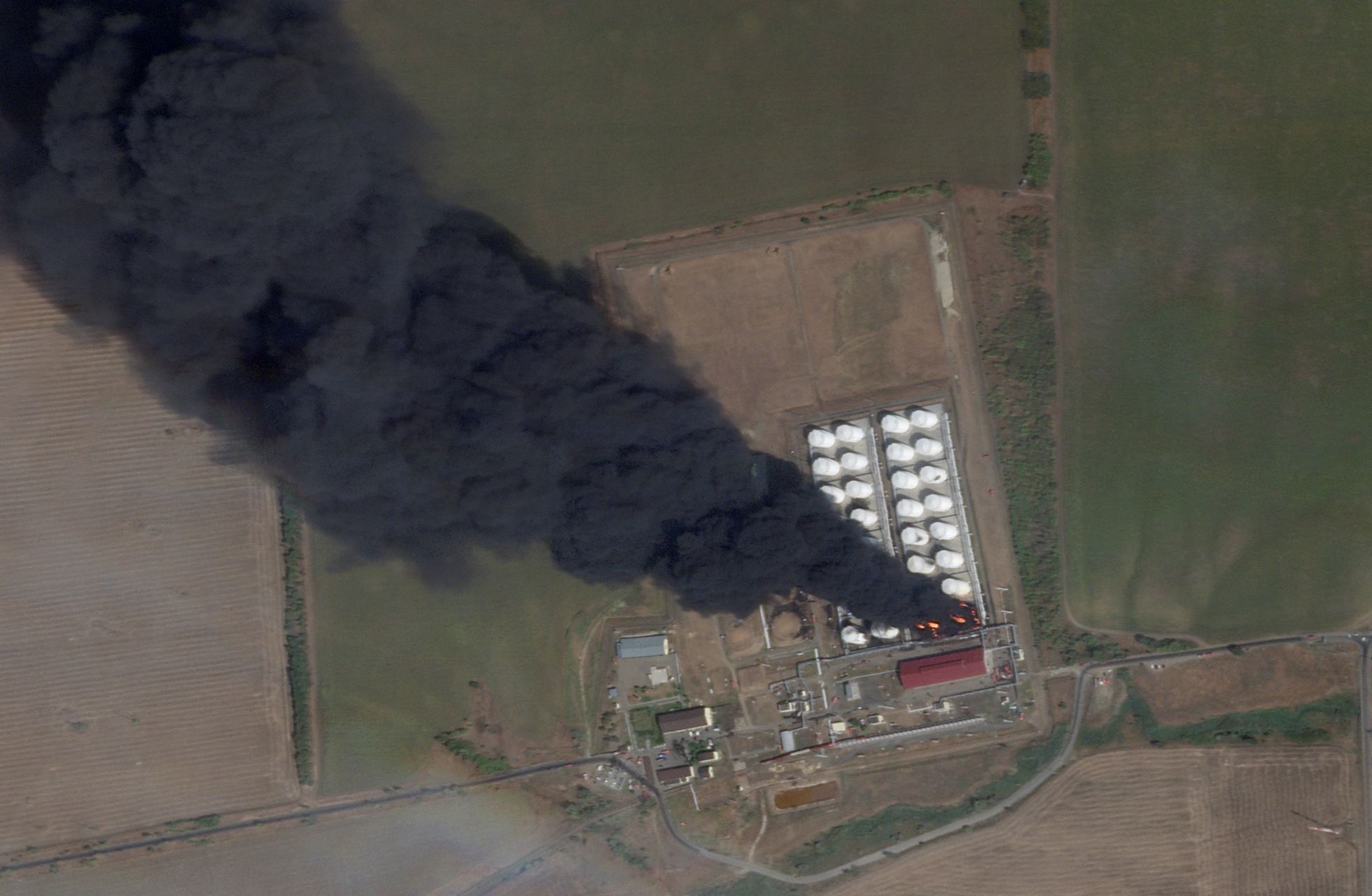 - В Каменском районе Ростовской области, где после атаки беспилотников загорелась нефтебаза, ввели режим повышенной готовности, сообщил в телеграм-канале глава администрации района Владимир Савин. Такой режим вводят, если есть угроза возникновения чрезвычайных ситуаций. По словам главы района, спасатели тушат пожар круглосуточно, жилым домам ничего не угрожает. Нефтебаза горит второй день.