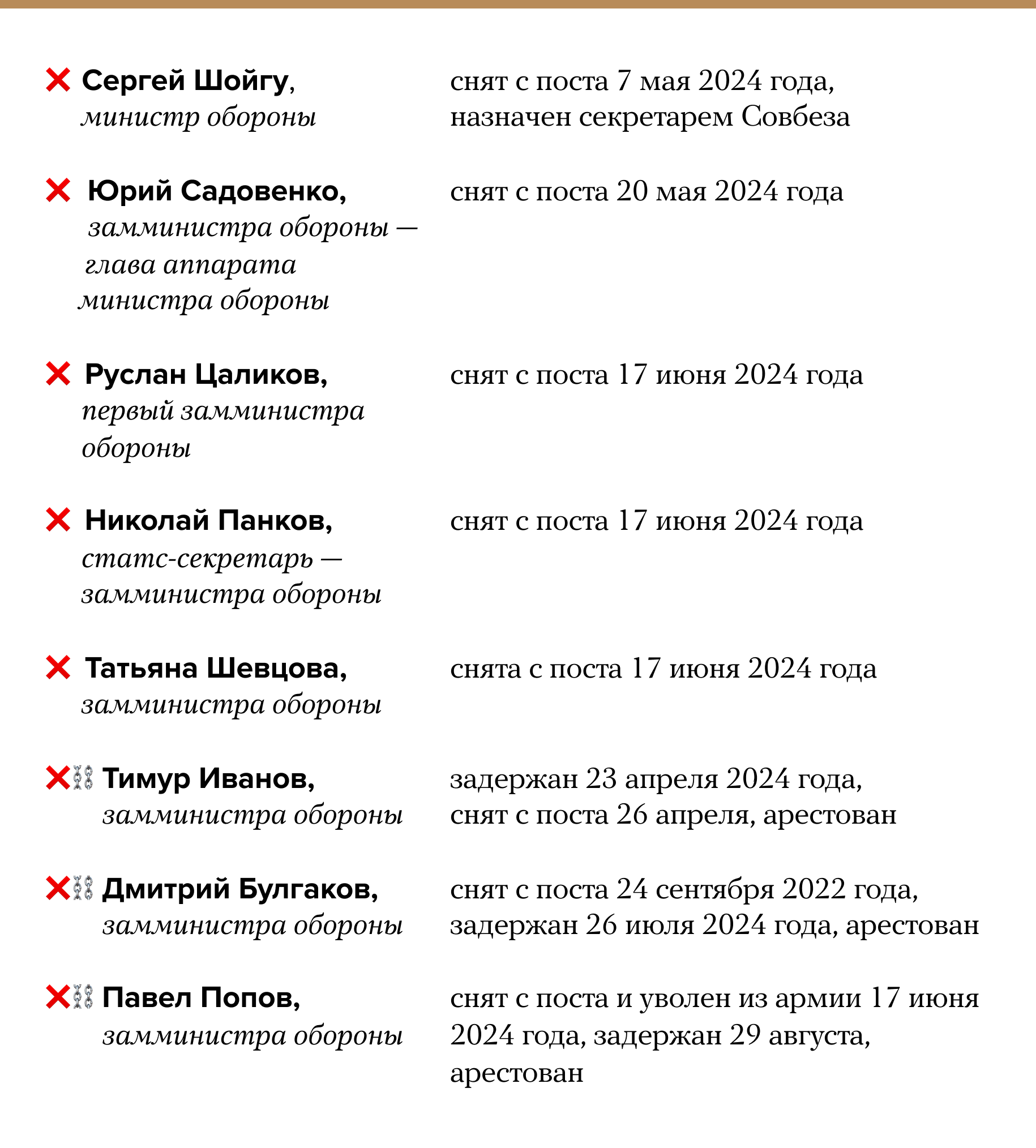 В министерстве обороны РФ пятый месяц продолжаются чистки. Следственный комитет сообщил 29 августа, что задержал по делу о мошенничестве бывшего заместителя министра обороны Павла Попова. В тот же день его арестовали. Попов стал третьим военачальником — заместителем Сергея Шойгу, попавшим под стражу. Ранее под арестом оказались Тимур Иванов и Дмитрий Булгаков (в апреле и июле соответственно). За последние месяцы своих постов в Минобороны лишились шестеро заместителей Шойгу. Уголовные дела возбудили против несколькихвысокопоставленныхвоенных.