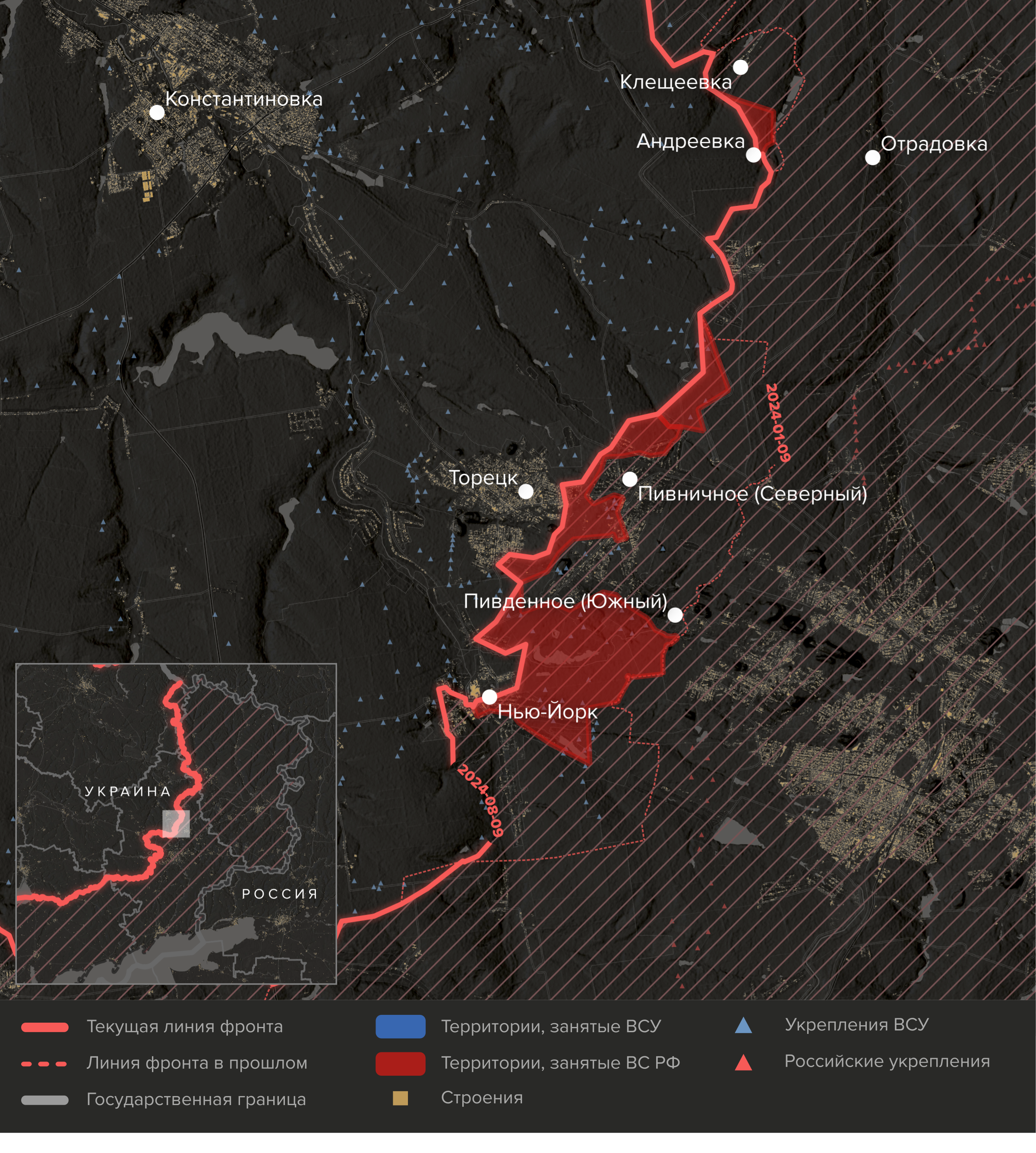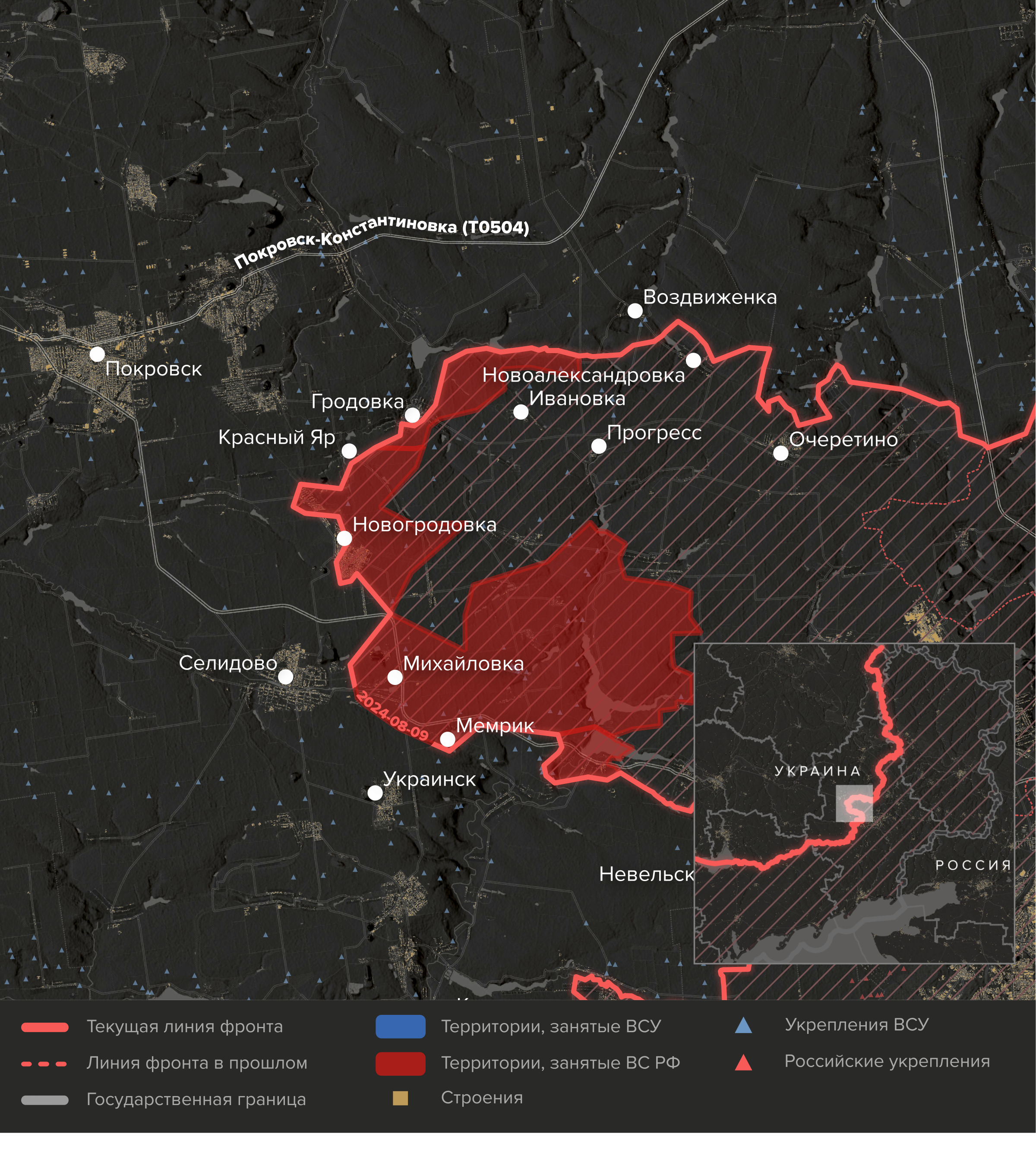 - Разворот российского наступления у Покровска на юг привел к острому кризису обороны ВСУ. Украина за несколько дней потеряла город Новогродовку (захвачена ВС РФ почти полностью), а также не смогли остановить продвижение российской армии к востоку от этого города. В результате ВС РФ вклинились в оборону ВСУ до городов Селидово и Украинск, перерезав пути снабжения всей украинской группировки восточнее этого района.