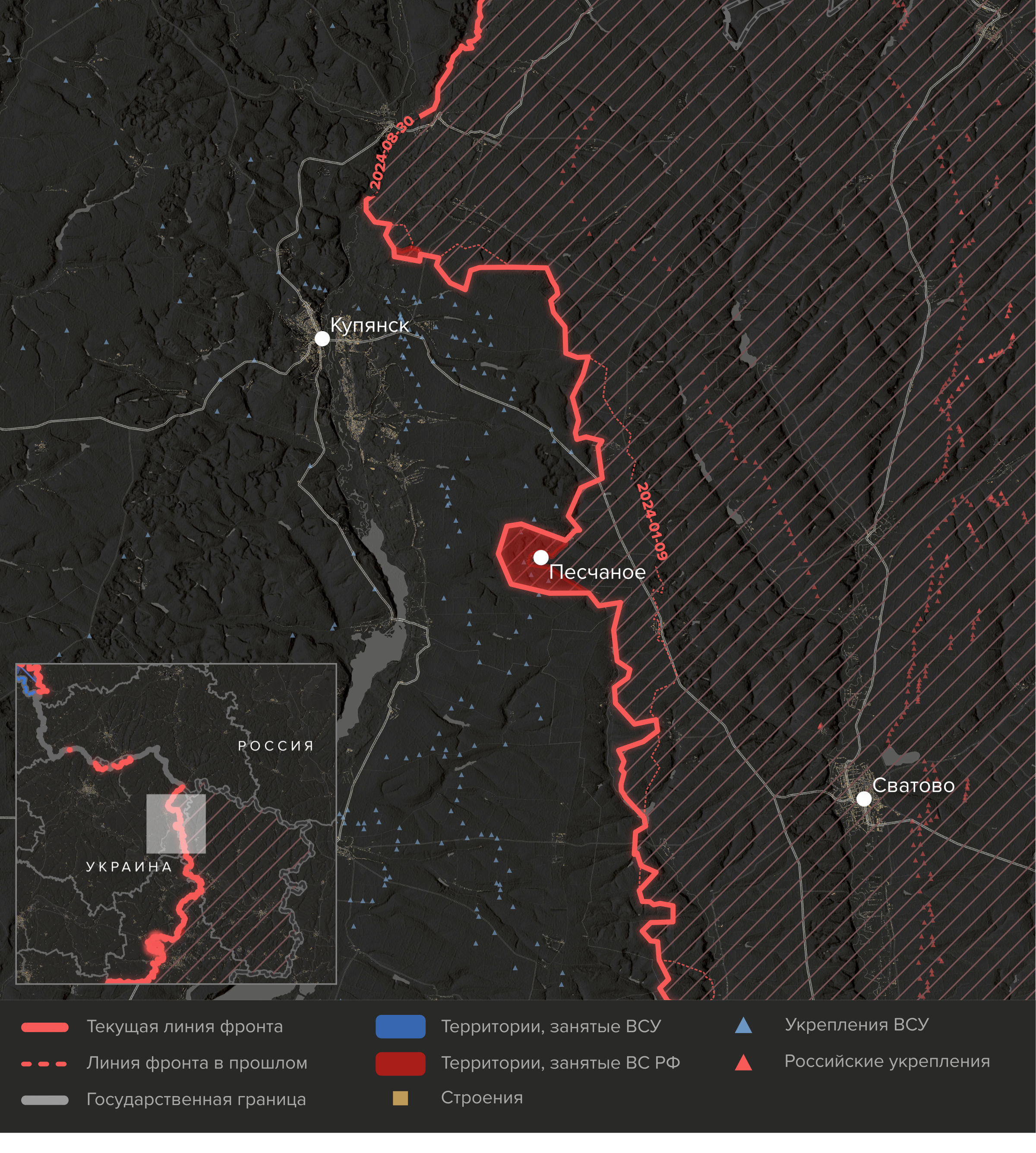 ВС РФ продвинулись на несколько километров от захваченного ими ранее Песчаного в направлении реки Оскол. Расстояние от передовых позиций до реки составляет около 8 километров