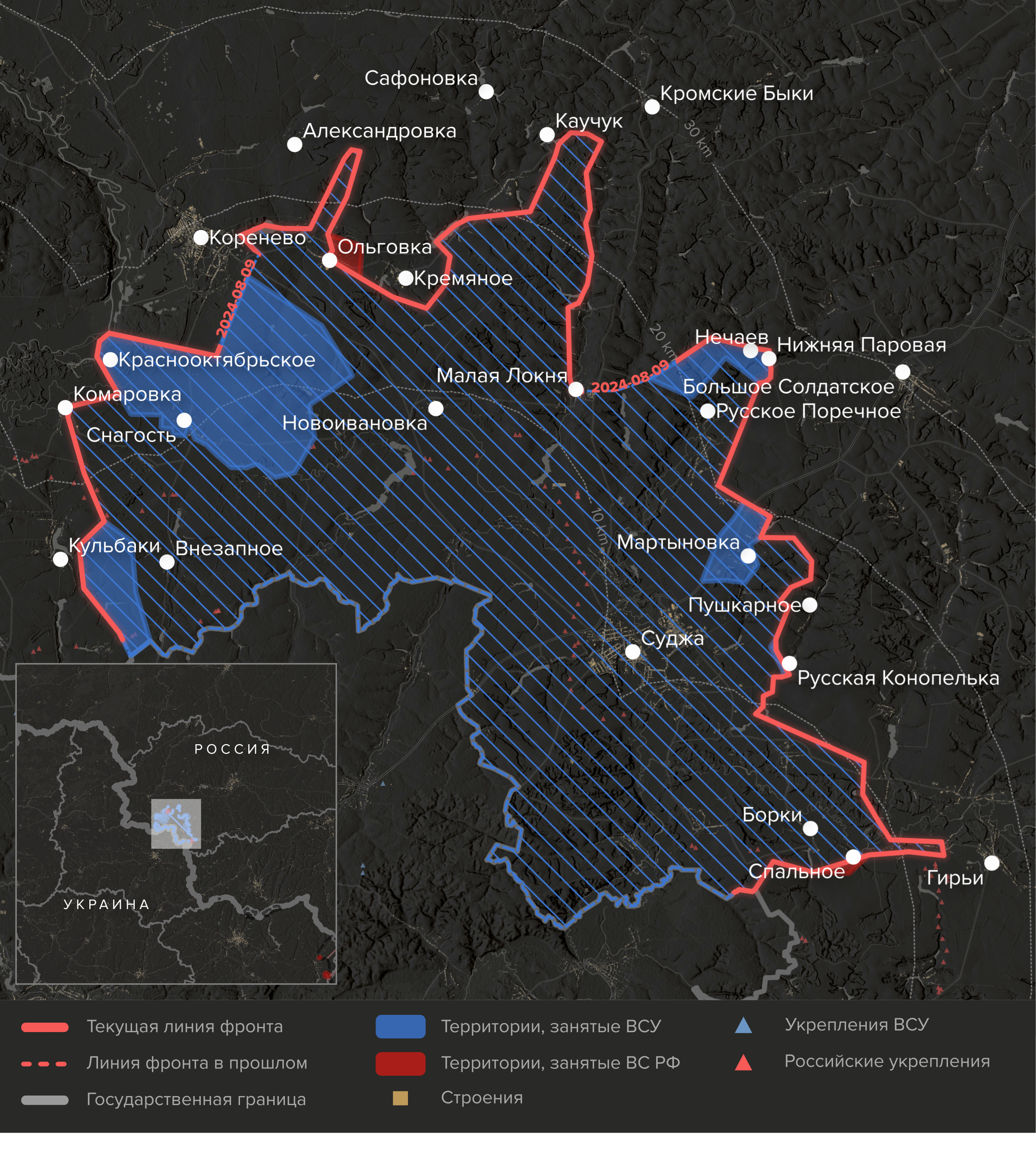- ВСУ удалось решить несколько тактических задач: они захватили село Мартыновка у трассы Суджа — Курск и пытаются продвинуться дальше на север к западу (в районе Нечаева и Нижней Паровой) и к востоку (в районе Пушкарного) от этой дороги. Цель этого наступления — выход ВСУ к райцентру Большое Солдатское.