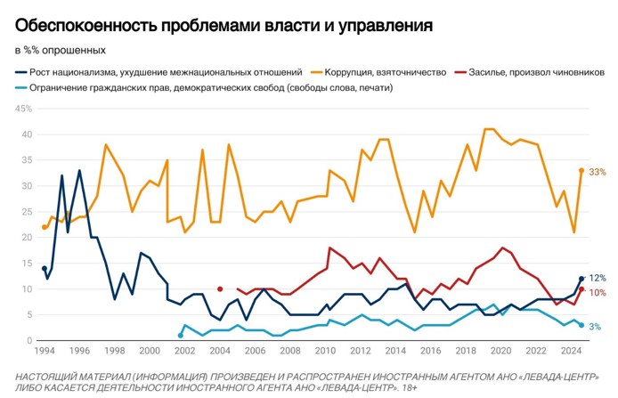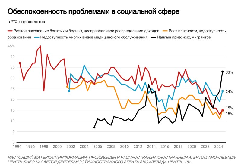 Иная природа у роста беспокойства по поводу миграции и коррупции. Отношение к мигрантам стало более негативным после теракта в «Крокус Сити Холле», говорит Волков. Неприязнь к приезжим подогревают и власти своими заявлениями об ограничении миграции и высылкой приезжих из страны, считает Волков.