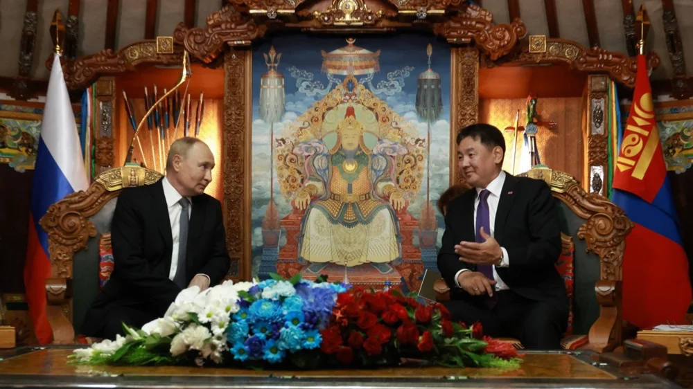 Vladimir Putin meets with Mongolian President Ukhnaagiin Khurelsukh during his visit to Ulaanbaatar, Mongolia on Tuesday. Photo: EPA-EFE/VYACHESLAV PROKOFIEV / SPUTNIK / KREMLIN POOL / POOL