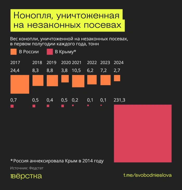 За первое полугодие 2024-го в аннексированном Крыму отчитались об уничтожении на незаконных плантациях аномально большого объёма конопли — 231‑й тонны. Это в 86 раз больше, чем по всей России, и в сотни раз больше предыдущего крымского максимума 2017 года. При этом, если верить официальным данным, незаконные плантации в Крыму показывают нереальную урожайность — 112 кг конопли на 1 кв. м. Адекватного объяснения такой статистики нет. Крымские силовики могли начать учитывать уничтоженную массу дикой конопли как выращенную на незаконных плантациях, а источники «Вёрстки» в регионе утверждают, что заметили ужесточение борьбы с местными поставщиками и потребителями конопли.