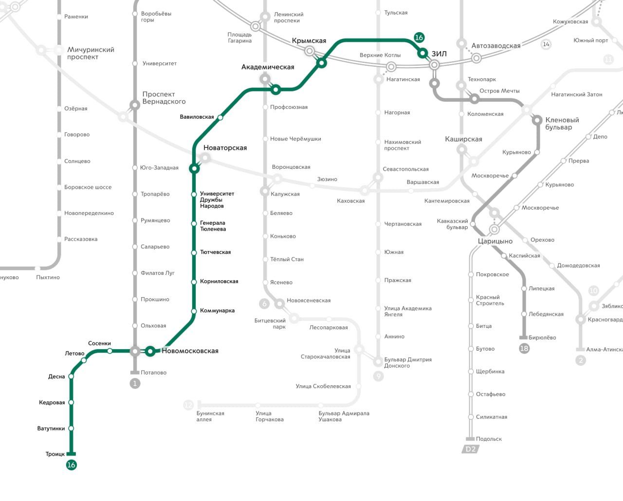 На Троицкой линии, как ожидается, будут построены 17 станций. — от станции Московского центрального кольца «ЗИЛ» в Даниловском районе до Троицка на юго-западе Москвы. Общая длина ветки составит 43 километра, это будет один из самых протяженных радиусов московского метро и самым большим за МКАД.