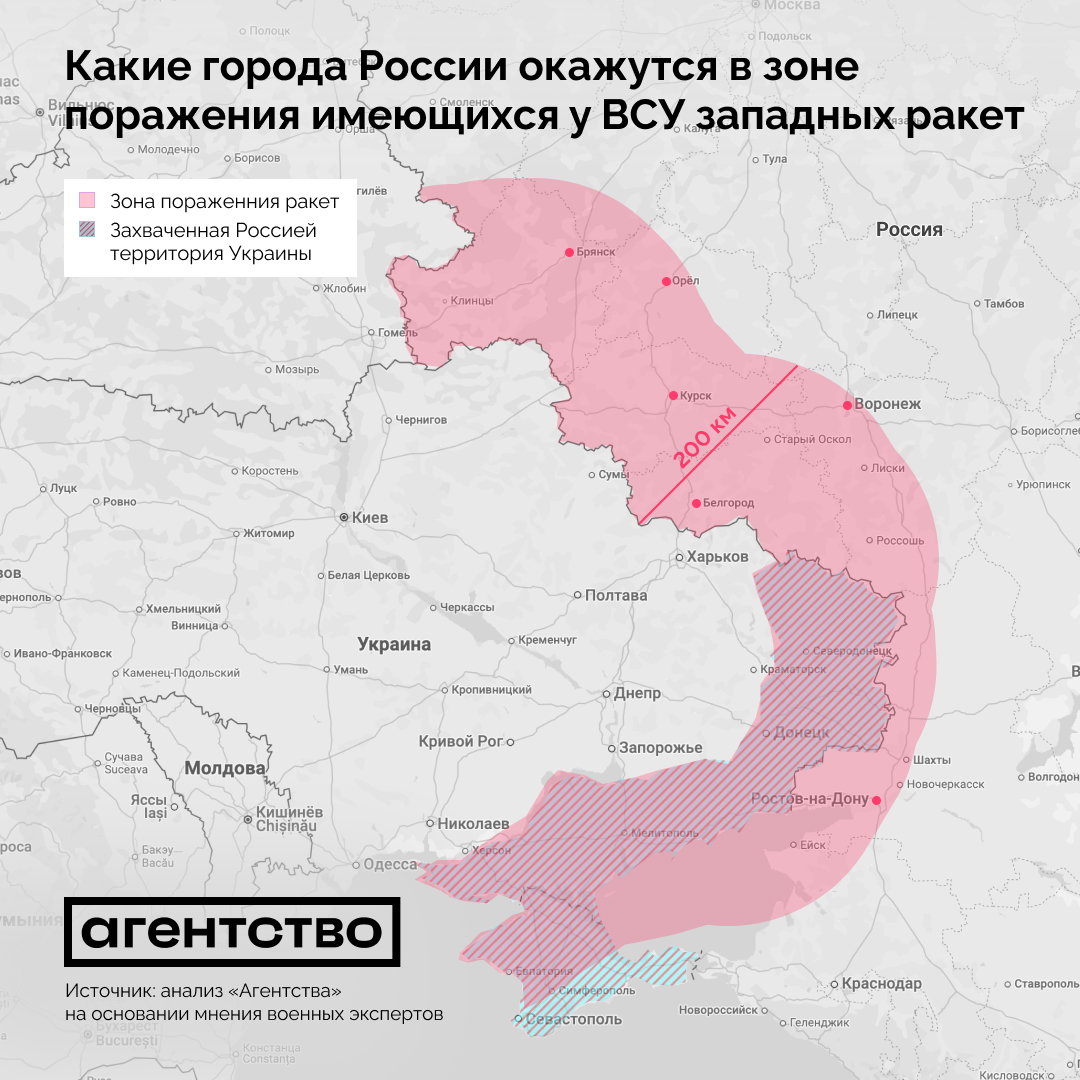 В четверг Владимир Путин попытался напомнить о том, что разрешение на использование западных ракет для нанесения ударов по целям на территории России является «красной линией». Это стало ответом на заявления западных политиков и публикации в СМИ, из которых следует, что Киев в ближайшие недели с большой долей вероятности получит разрешение на использование западных ракет для нанесения ударов по целям на территории России. Ответ Путина не убедил даже российских z-блогеров, поскольку из него следовало, что президент не считает российскими аннексированные регионы Украины. «Агентство» с помощью военных аналитиков проанализировало, какие города окажутся в зоне поражения, когда Киев получит разрешение на использование западного оружия.