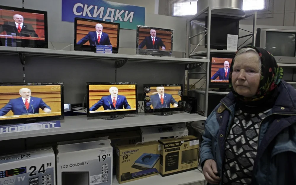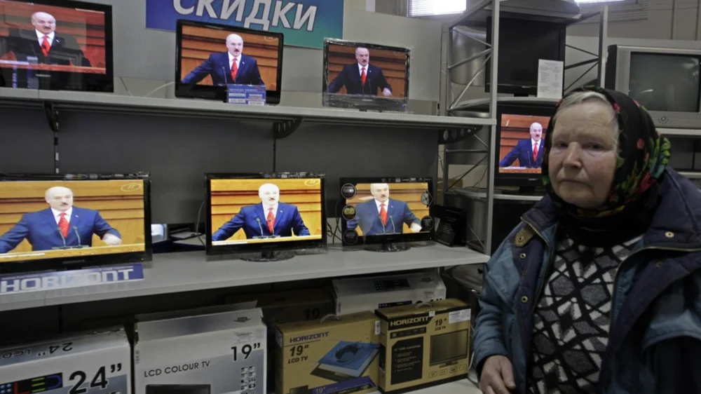 A woman chooses a television set in a shop as Alexander Lukashenko speaks during his annual message to the Belarusian people. Minsk, Belarus, April 2011.