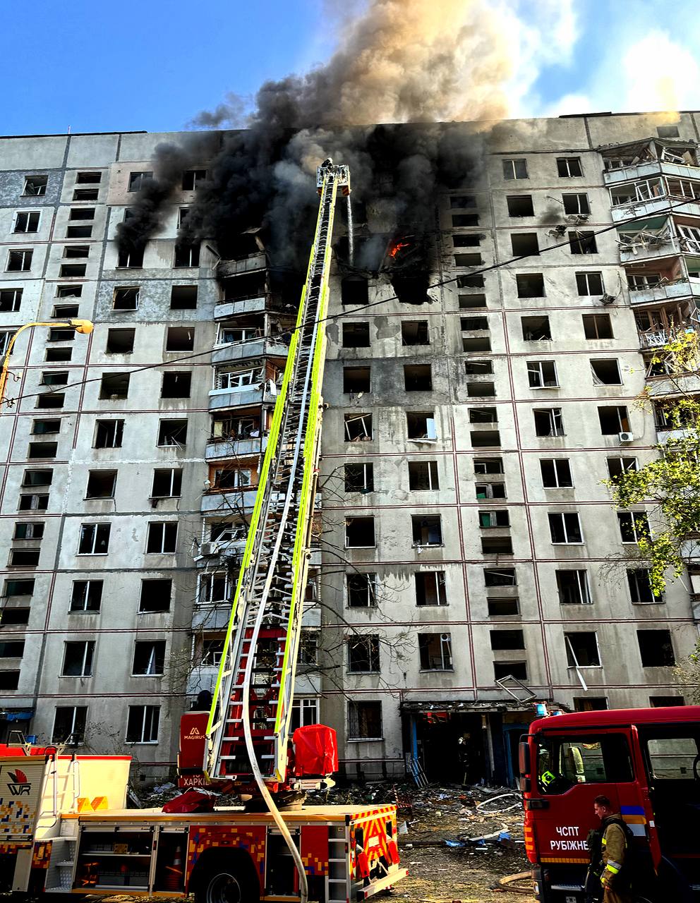 «Между 9-м и 12-м этажами — пожар и завалы», — написал президент Украины Владимир Зеленский. По словам мэра Харькова Игоря Терехова, удар пришелся по десятому этажу.
