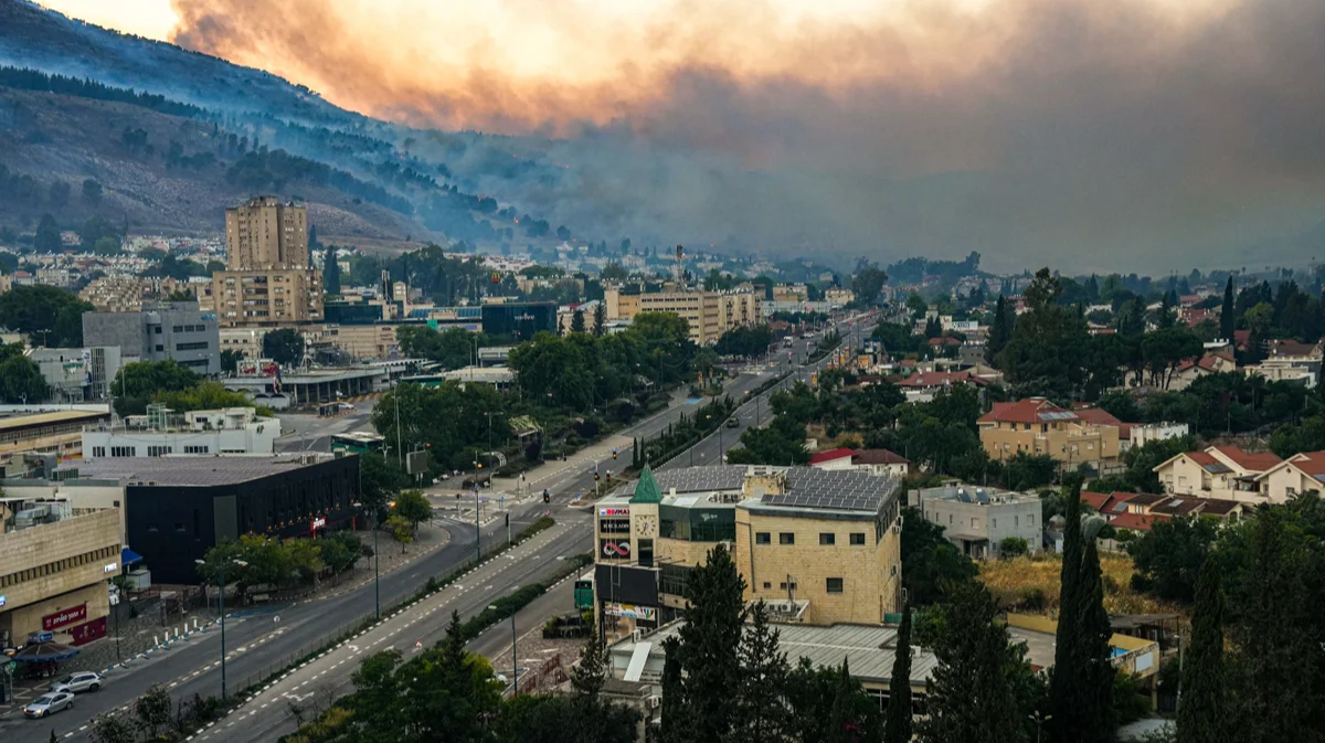 Дым и огонь поднимаются над районом Кирьят-Шмона после ракетного обстрела с ливанской стороны, Израиль, 3 июня 2024 года. Фото: Ayal Margolin / Xinhua / Action Press / Vida