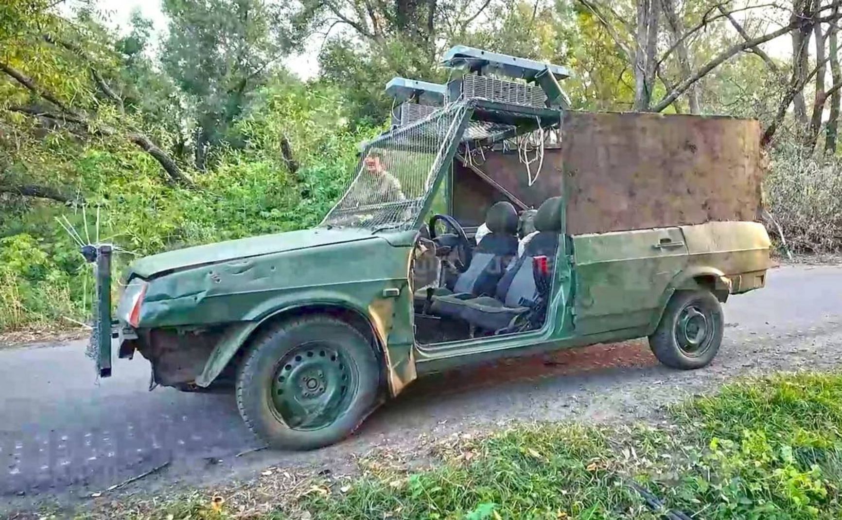 Telegram-канал ROSGVARDIA_RUSSIA публикует фотографии легкового автомобиля «Лада», достойного вселенной «Безумный Макс», который стоит на вооружении бойцов 155-й ОБрМП в Курской области. Задняя часть корпуса снята и заменена на бронелисты, а вместо ветрового стекла установлена противодроновая сетка.