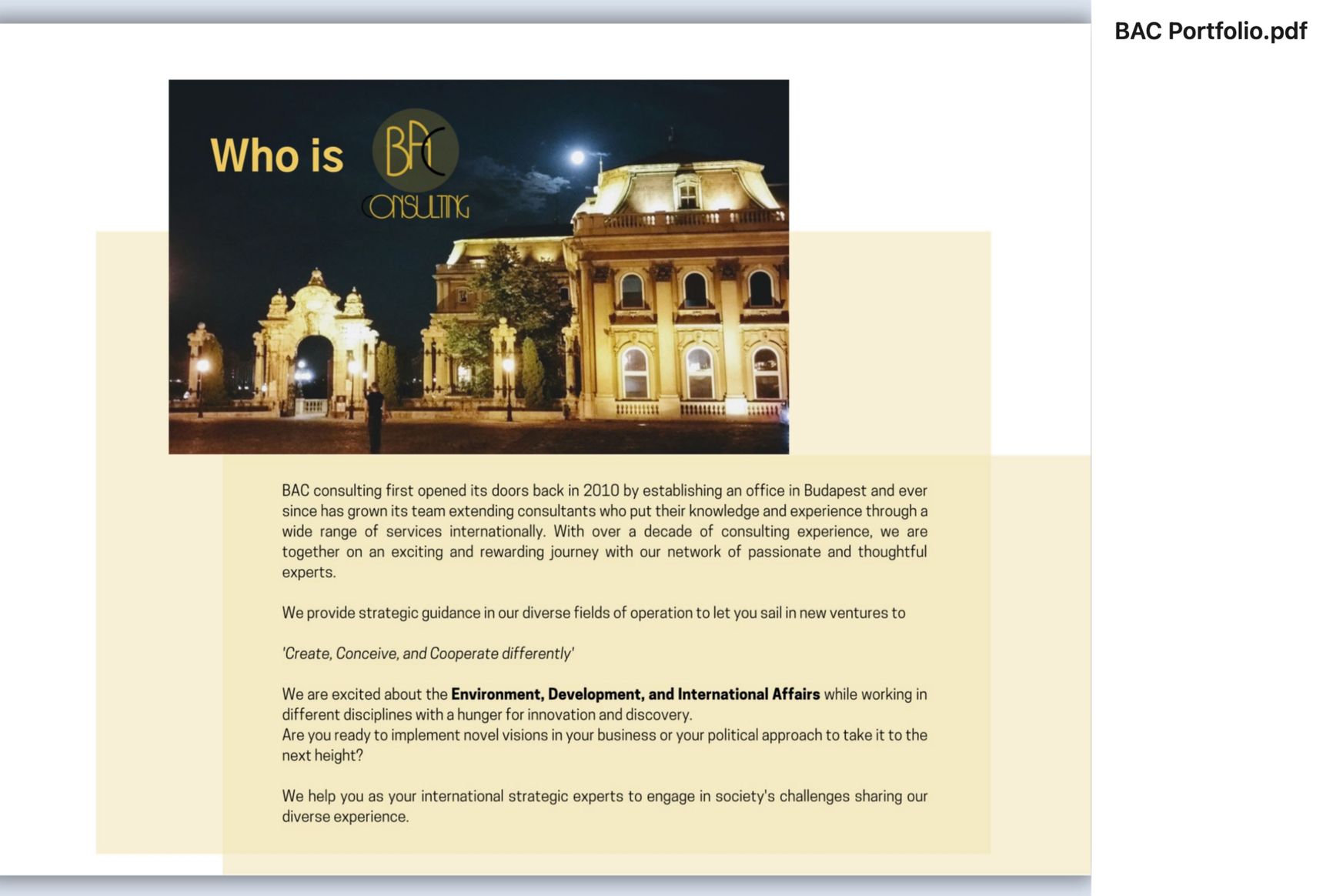 Компания как в уставных документах, так и на сайте утверждала, что занимается консультированием. Основными сферами своей компетенции компания называла «окружающую среду, развитие и международные отношения», а генеральным директором и основателем — Кристиану Арчидиаконо-Баршонь. В социальной сети для профессионалов LinkedIn есть профиль девушки с той же фотографией, однако свою фамилию она пишет как Баршонь-Арчидиаконо. На странице Кристианы также размещено портфолио BAC Consulting, где сказано, что компания основана в 2010 году — это противоречит информации государственного реестра компаний Венгрии. Баршонь-Арчидиаконо указывает в своем резюме, что возглавляла BAC Consulting с 2019 года.