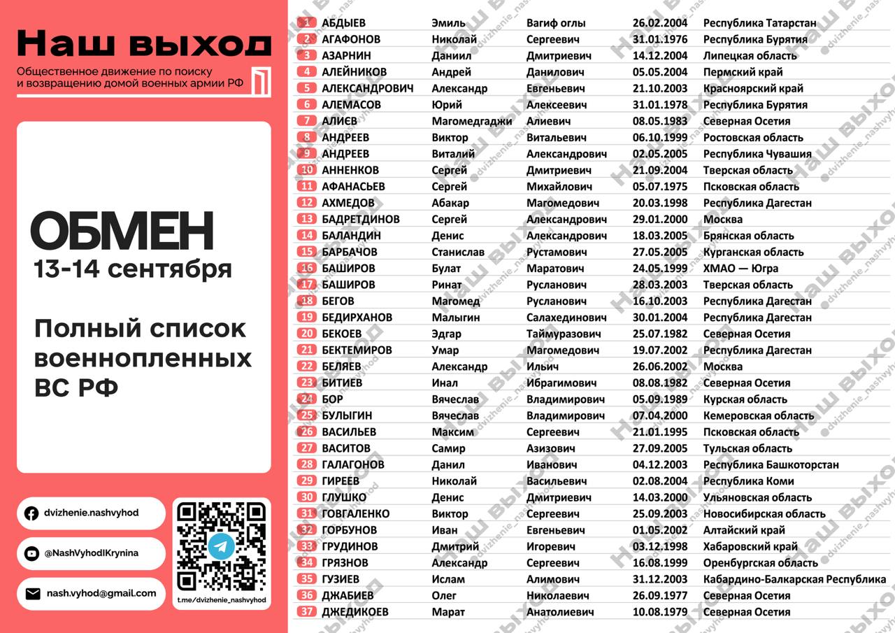 14 сентября завершился начавшийся накануне обмен военнопленными. Россия забрала еще 103 (в общей сложности 147) своих военнопленных, сдавшихся в Курской области в прошлом месяце