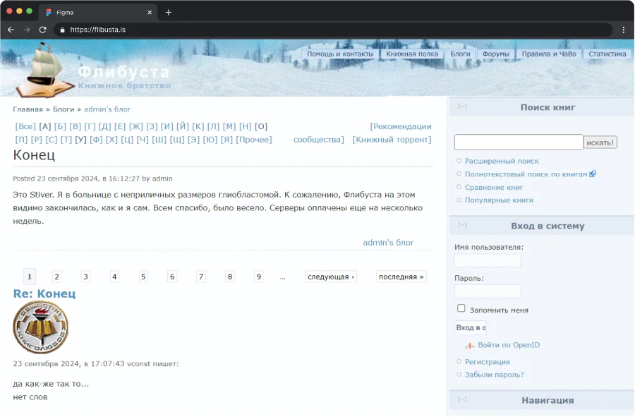23 сентября 2024 создатель «Флибусты» взорвал сообщество независимого библиотечного ресурса неожиданным постом, озаглавленным «Конец». «Это Stiver. Я в больнице с неприличных размеров глиобластомой. К сожалению, Флибуста на этом, видимо, закончилась, как и я сам. Всем спасибо, было весело. Серверы оплачены еще на несколько недель».