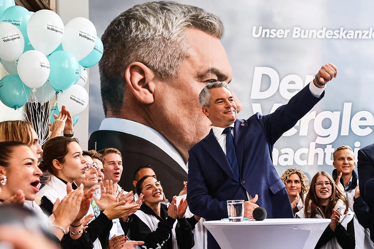 Канцлер Австрии и глава правящей Австрийской народной партии (OVP) Карл Нехаммер во время предвыборного митинга партии в Вене, Австрия, 27 сентября 2024 года. Фото: Filip Singer / EPA-EFE