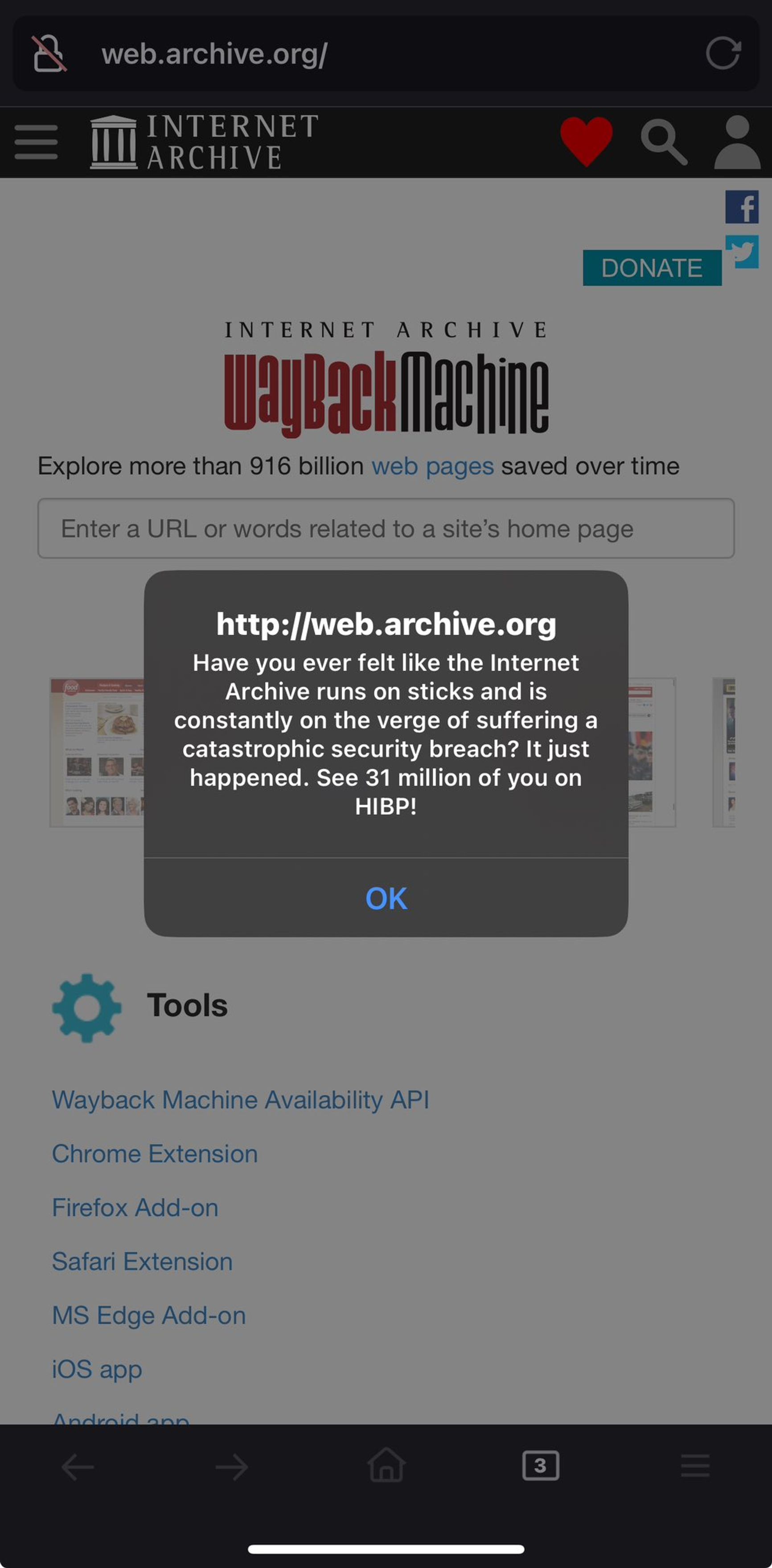 Сайт The Wayback Machine — архив интернет-страниц и одна из крупнейших в мире интернет-библиотек — был взломан, а также подвергся DDOS-атаке, из-за которой оказался частично недоступен 9 и 10 октября. Хакеры разместили на главной странице библиотеки уведомление о том, что сайт взломан и пароли 31 млн пользователей украдены.