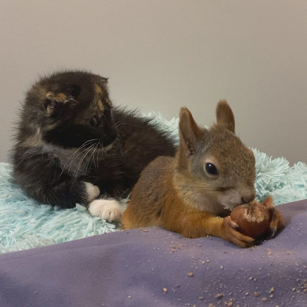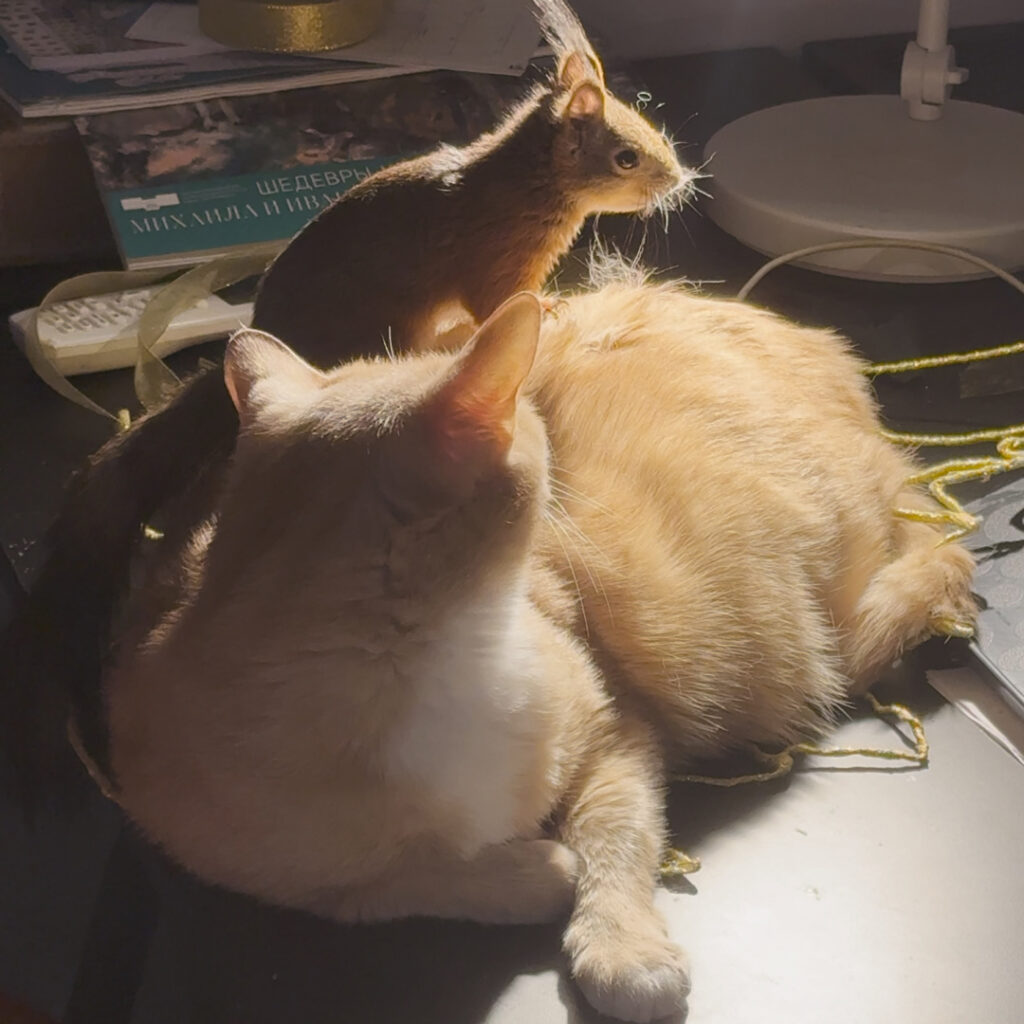 Щенок у нас был на передержке, и мы водили его к зоопсихологу, потому что он сильно лаял — чувствовал, что где-то рядом белка. Но сейчас мы его уже пристроили, а с котами белку было несложно знакомить. Так сложилось, что из шести котов трое с ней супердружелюбные и спокойно себя ведут, а трое любят поиграть в догонялки. Чтобы Ола не нервничала, мы не пускаем к ней тех трех догоняющих котов, а с остальными она ладит, играет.