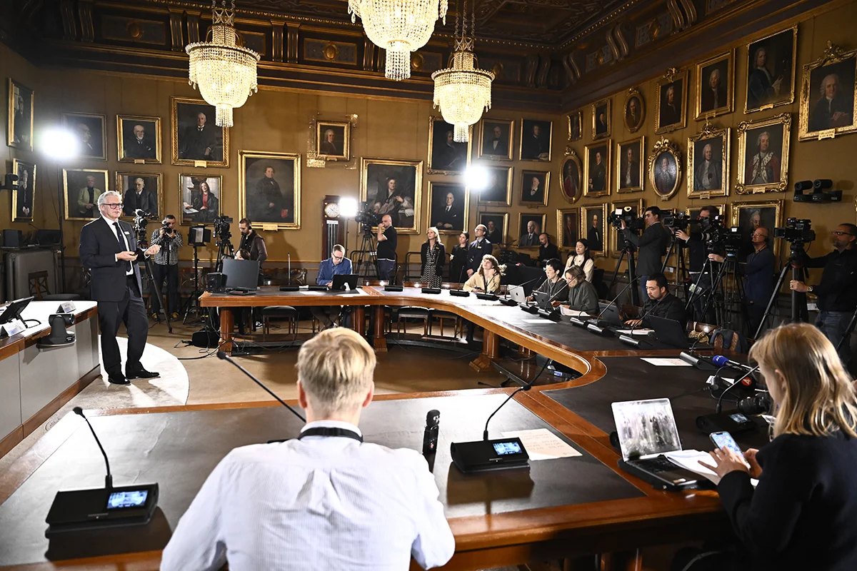 Представители Нобелевской ассамблеи Шведского Риксбанка объявляют о присуждении премии Шведского Риксбанка в области экономических наук памяти Альфреда Нобеля за 2024 год, которая присуждается Дарону Асемоглу, Саймону Джонсону и Джеймсу Робинсону, Стокгольм, Швеция, 14 октября 2024 года.Фото: Christine Olsson / EPA-EFE