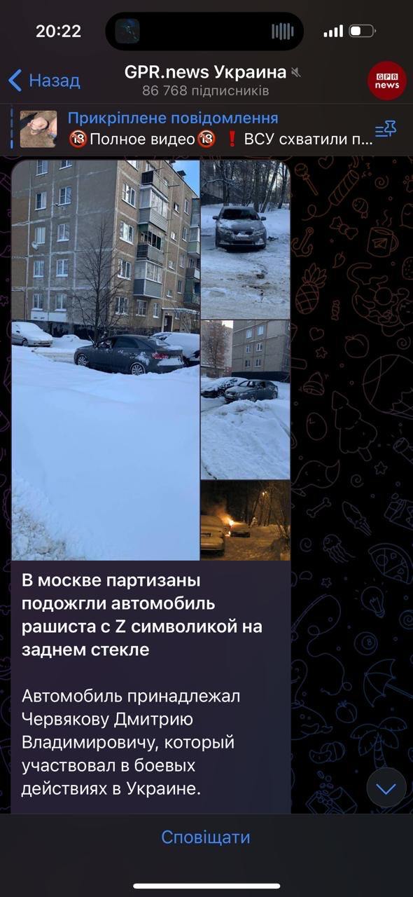 10 февраля, когда Балог был уже в руках силовиков, в закрытом телеграм-канале «GPR.News Украина» появился пост: в Москве «партизаны» подожгли украшенный Z-символикой автомобиль «рашиста» — участника войны в Украине Дмитрия Червякова.