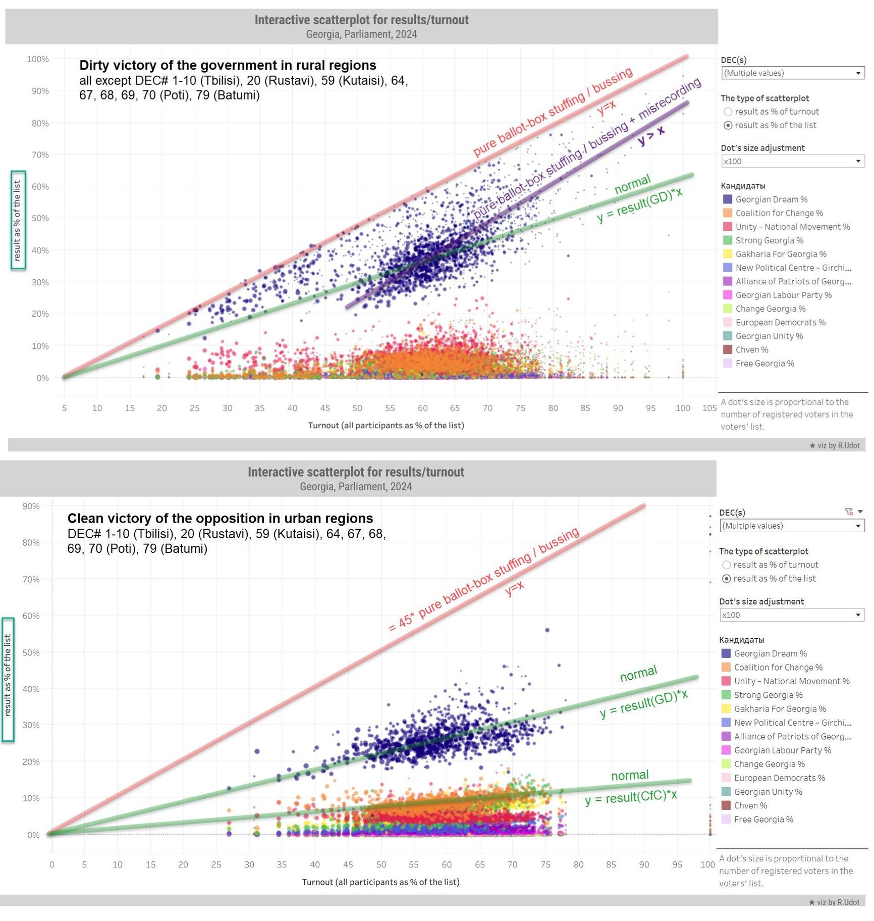 The top chart shows voting patterns in rural areas, with an abnormal upward diagonal shift of the "cloud" of votes for the Georgian Dream party. The bottom chart shows the results in urban areas, where there is no basis to suspect fraud.