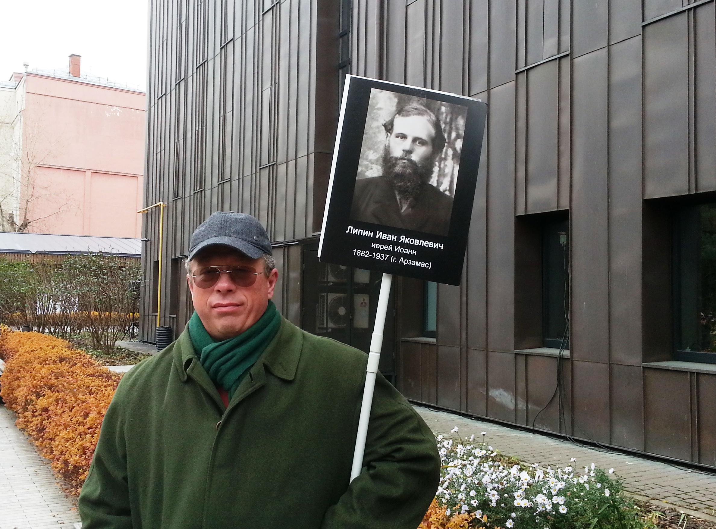 "Молитва памяти" – гражданский проект, но у него есть отчетливая религиозная составляющая. Уже третий год подряд Музей проводит эту поминальную акцию совместно с Преображенским братством. Вход сюда свободный в течение всего дня для всех желающих. Здесь принято не только читать у микрофона имена пострадавших от репрессий, но и отправлять службу по православному канону. Только вот текст таких молитв вряд ли услышишь в иные дни и в иных местах. Около постоянного экспоната – подлинной деревянной лагерной вышки – установили икону, на земле зажгли поминальные свечи, и священник, которого представили как отца Алексия из Сергиевского храма, перед тем как начать службу, счел нужным объяснить: