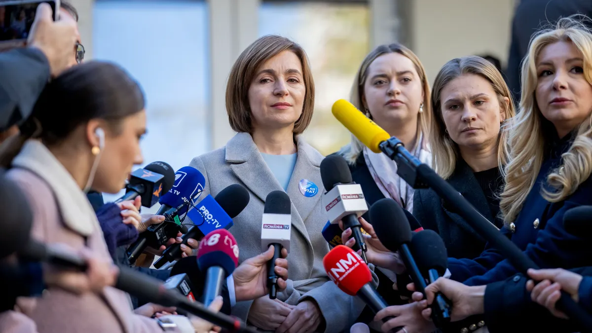 Moldovan President Maia Sandu speaks to reporters after casting her vote in the second round of voting in the country’s presidential election, 3 November 2024. Photo: EPA-EFE/DUMITRU DORU