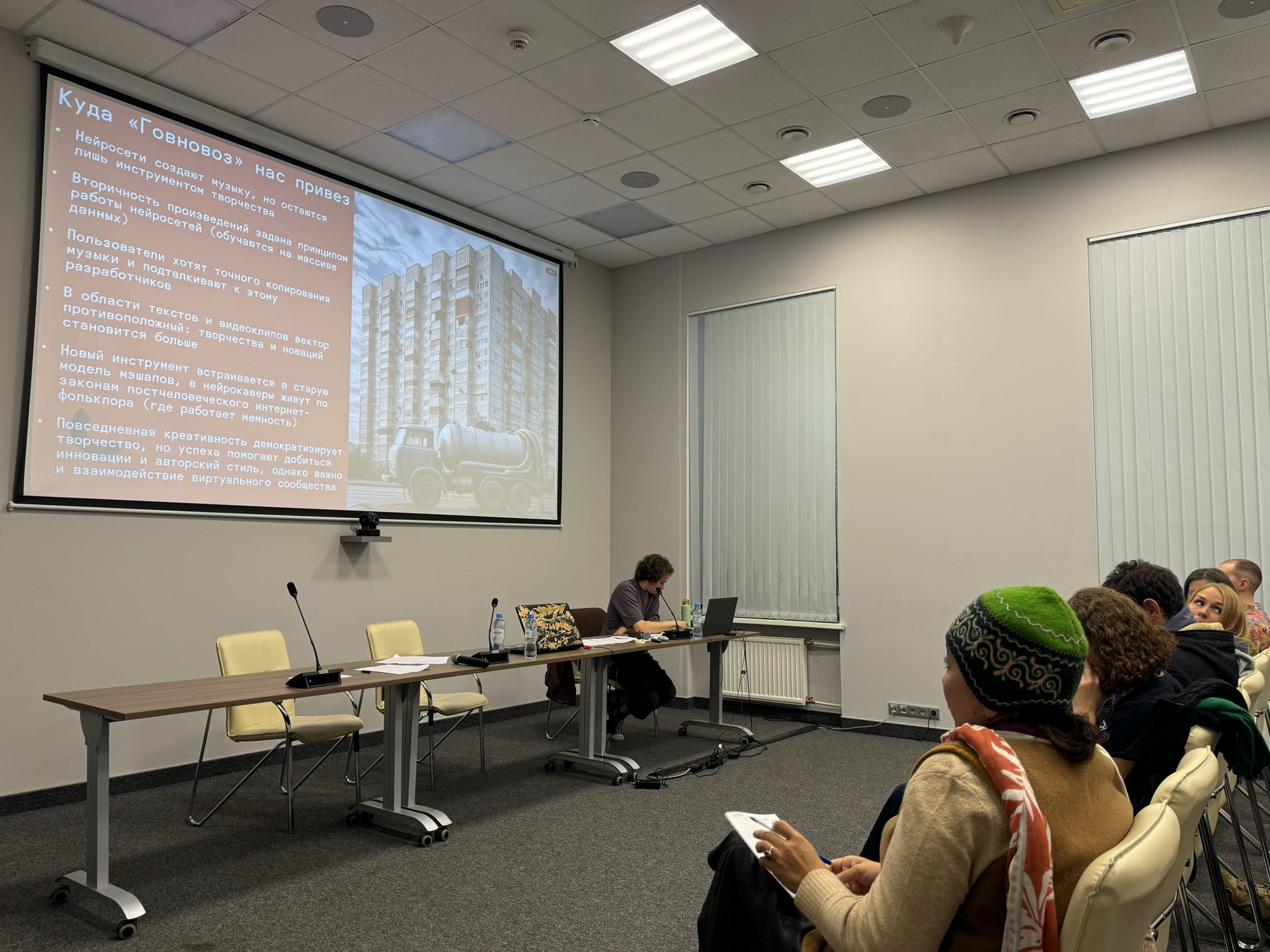 Михаил Алексеевский, руководитель Центра городской антропологии КБ Стрелка, взял для исследования мемные видео с ютуб-канала «ГОВНОВОЗ ФМ» — туда выкладывают сгенерированные нейросетями каверы на песню «Сорок лет, как под наркозом, я работал говновозом…» — и проанализировал, как использовался искусственный интеллект и как он изменил повседневную креативность.