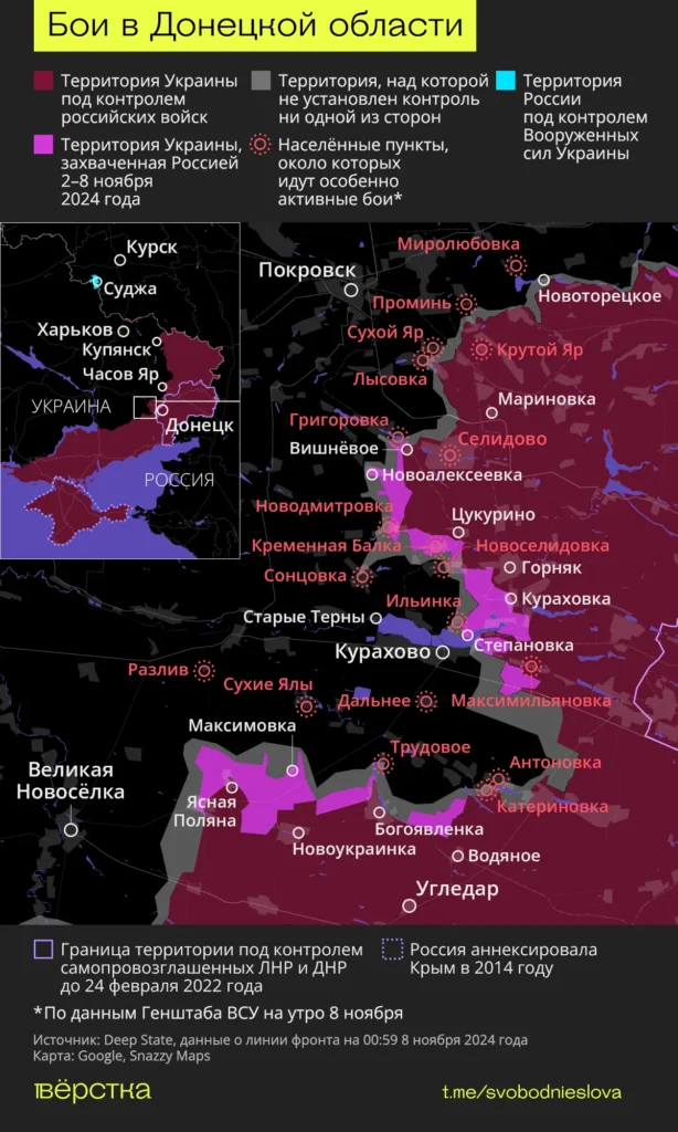 На покровском направлении российские военные продвинулись к северо-западу от посёлка Вишнёвое и юго-западу от посёлка Цукурино в районе сёл Новодмитровка и Кременная Балка. Утром 8 ноября DeepState сообщил, что ВС РФ оккупировали село Новоалексеевка на юго-западе от Вишнёвого. Минобороны РФ отчиталось о захвате Кременной Балки. Z‑каналы и украинский военный, ведущий канал «Офіцер», утверждают, что ВС РФ заняли половину Григоровки.