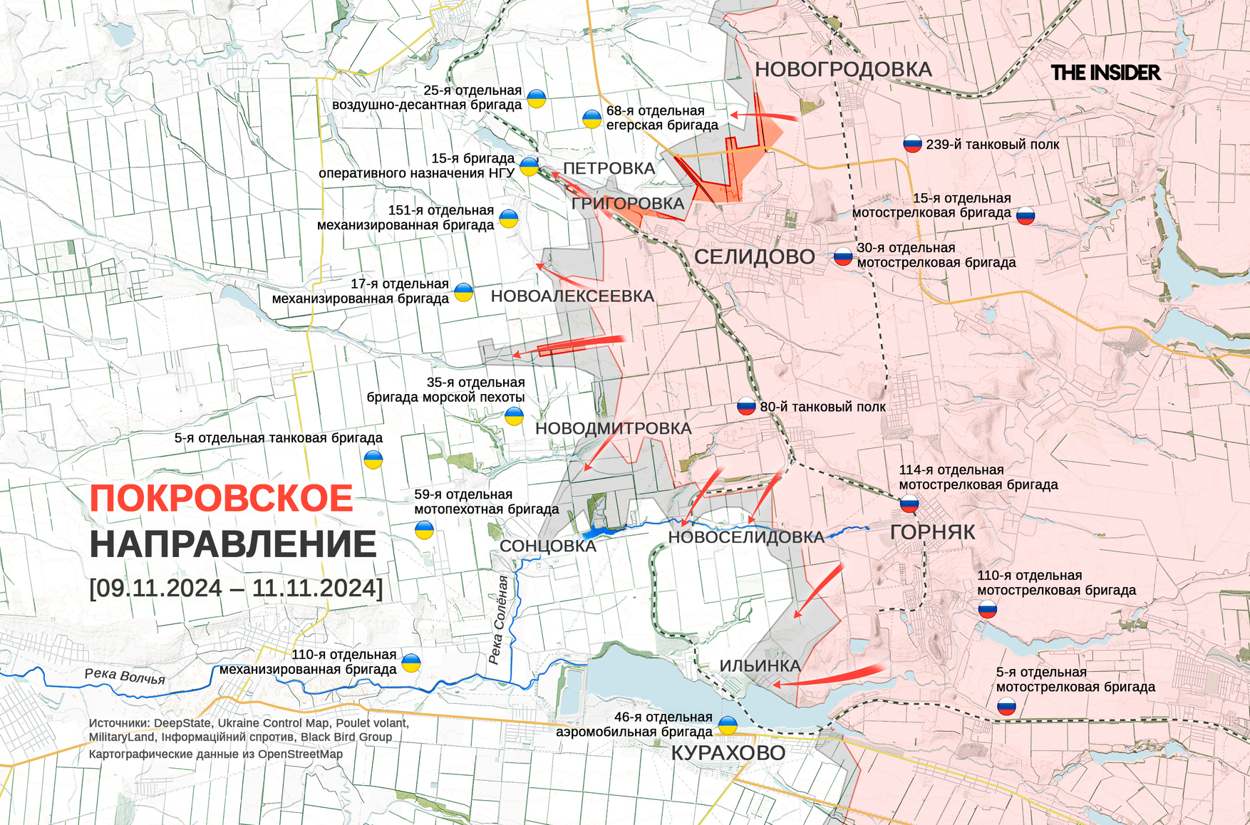 Напомним, что тот же Юрий Подоляка не далее как 8 ноября сообщал о глубоком прорыве морпехов из 810-й бригады — от Погребков вплоть до Старой Сорочины — с замыслом «срезать» весь северный «выступ» плацдарма ВСУ в Курской области. На следующий день он описывал сложившуюся ситуацию как «слоеный пирог, где устойчивого контроля нет ни у кого». Теперь же речь идет об окружении участвовавших в «прорыве» бойцов.
