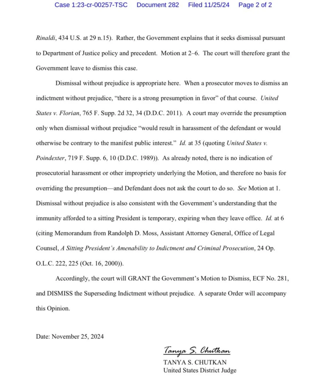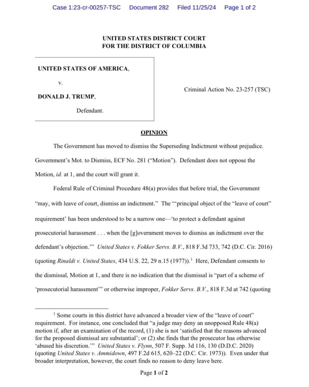 Судья окружного суда Таня Чаткен прекратила дела без вынесения решения. Ходатайство об этом ранее направил спецпрокурор Джек Смит. Свое решение он объяснил тем, что Минюст не может вести дела против избранного президента страны.
