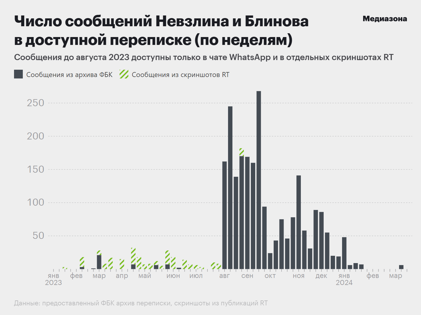 При этом собеседники явно активно переписывались и весной-летом 2023 года — об этом свидетельствуют приведенные RT в нескольких публикациях скриншоты. В это время обсуждались, к примеру, возмущавшие Невзлина твиты Максима Миронова и козни против ФБК вроде нападений на модель ШИЗО. Мы добавили к архиву скриншоты RT за эти даты — 233 сообщения (в инфографике они помечены отдельно).