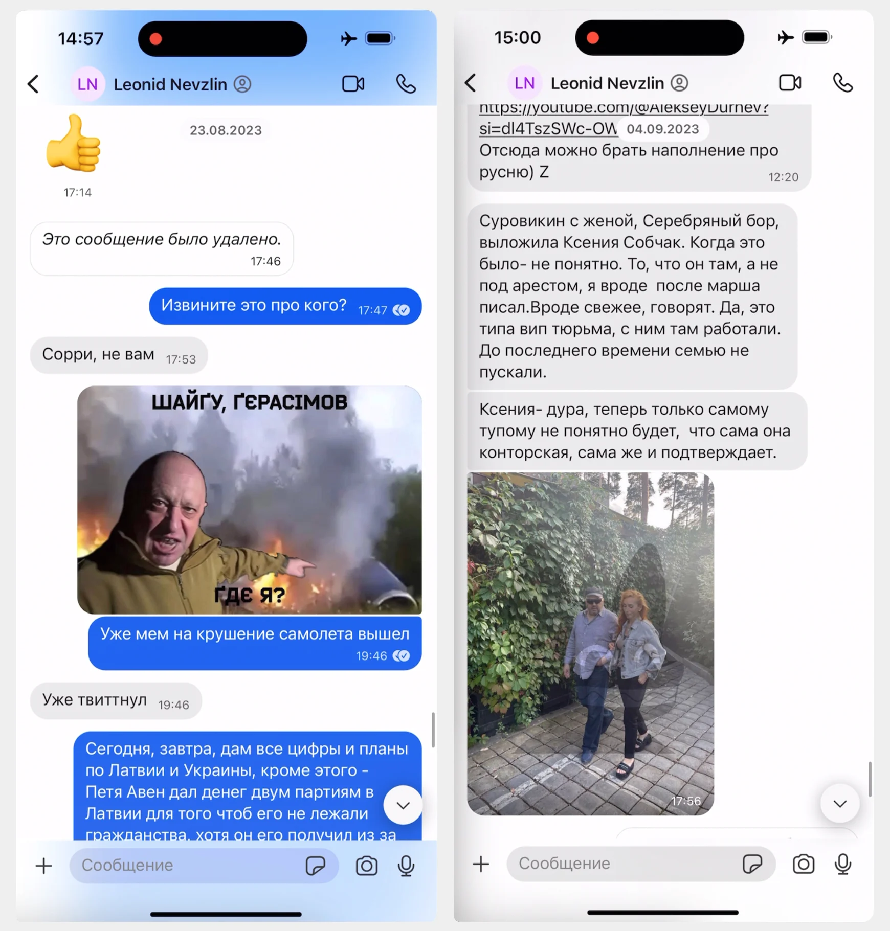 • Среди сообщений попадаются скриншоты переписки с третьими лицами. Например, Невзлин шлет скрины переписки с Марией Певчих, а Блинов — с латвийским журналистом Эдвином Ракицкисом. Оба подтверждают, что вели такую переписку.