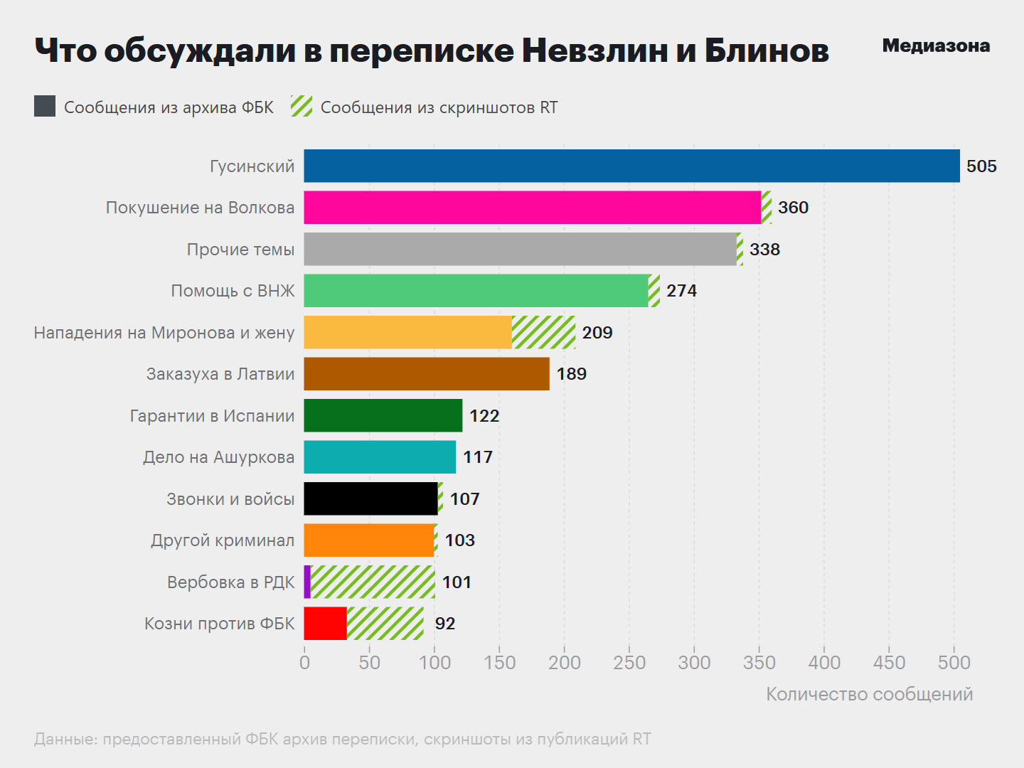 В итоге весь доступный для изучения «архив Невзлина» составил 2 529 сообщений, отправленных в пяти чатах и трех мессенджерах, установленных на разных смартфонах (у Невзлина их было два, у Блинова минимум три).