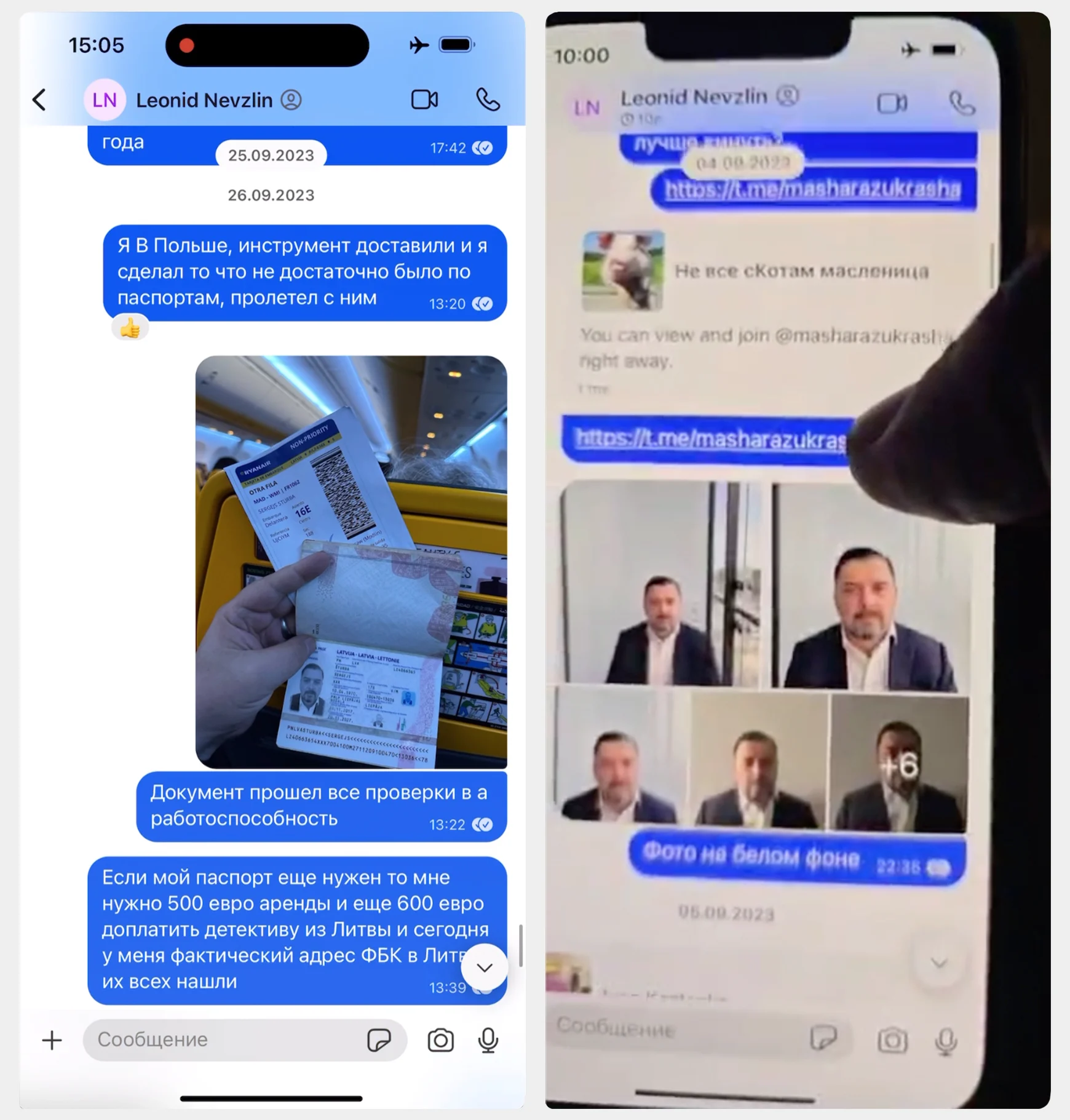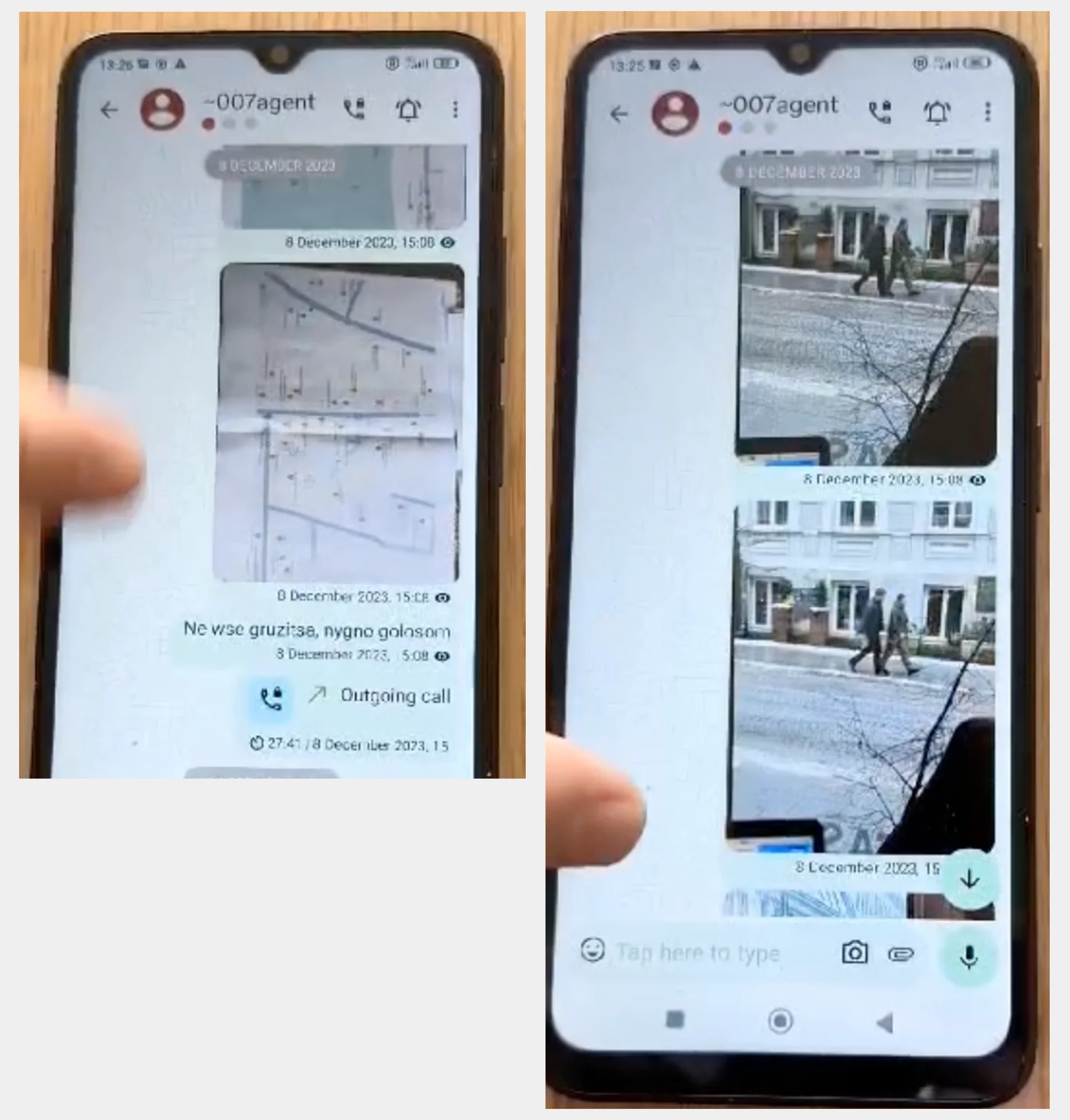 Два видео с нападениями. На них снят экран телефона, где проигрывается видео из переписки. На одном запечатлено нападение на открытие инсталляции с ШИЗО Навального в Женеве (10 июня 2023 двое мужчин забросали яйцами директора ФБК Ивана Жданова). На другом — нападение на Александру Петрачкову, жену экономиста Максима Миронова. Нападавший ударил ее по лицу, когда она шла по Буэнос-Айресу с десятимесячным сыном в коляске. Оба видео сняты нападавшими.