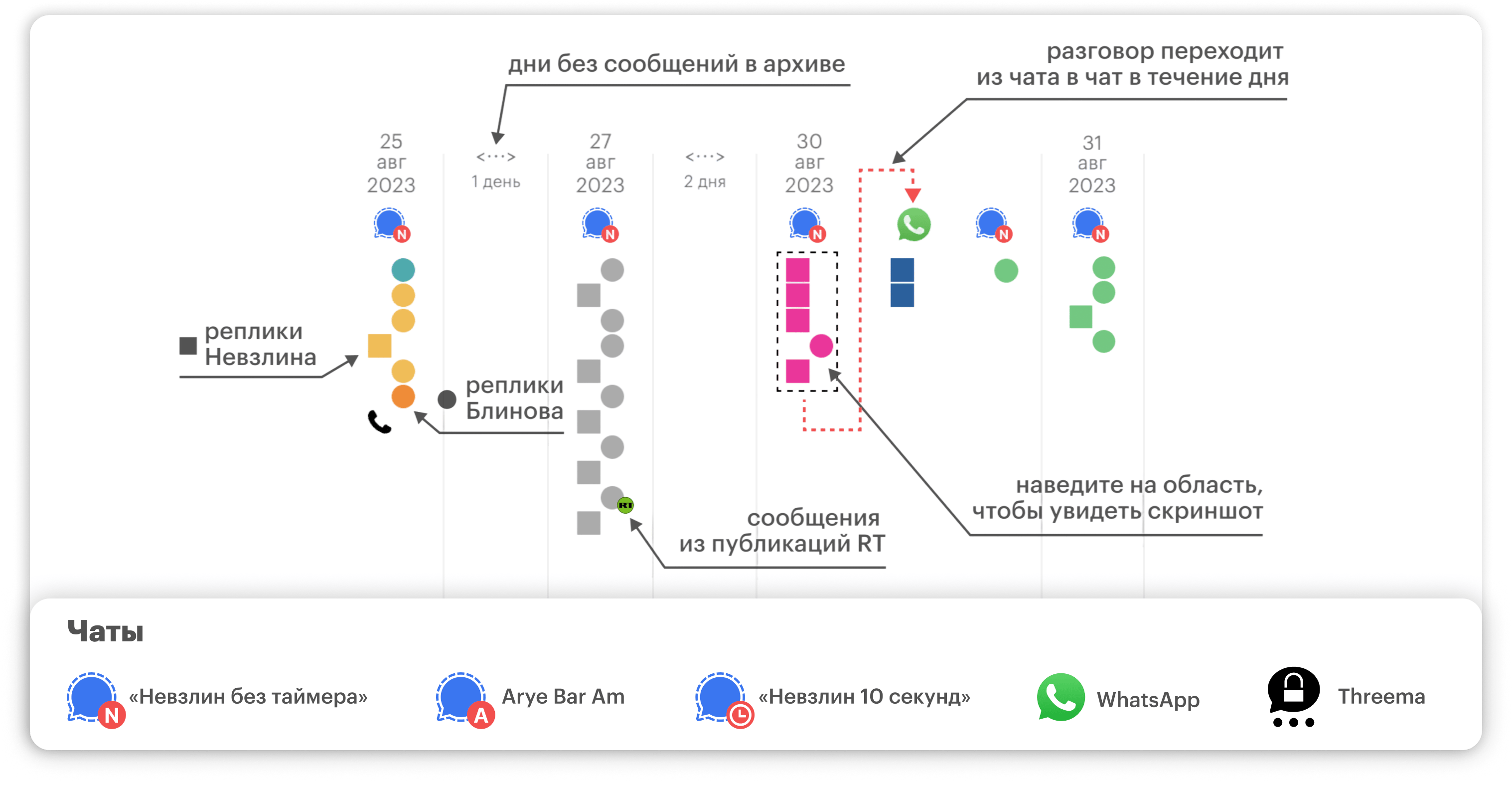 Мы восстановили хронологию и порядок сообщений в переписке. Она довольно сложно устроена — разговор постоянно перетекает из чата в чат, иногда ведется параллельно в разных мессенджерах. Видеозаписи, скринкасты и скриншоты из чатов делались в разное время и в разных часовых поясах. Собеседники, особенно Невзлин, часто пересылают свои диалоги с другими людьми — в сигнале такие сообщения никак не маркированы, и понять это можно только по контексту.