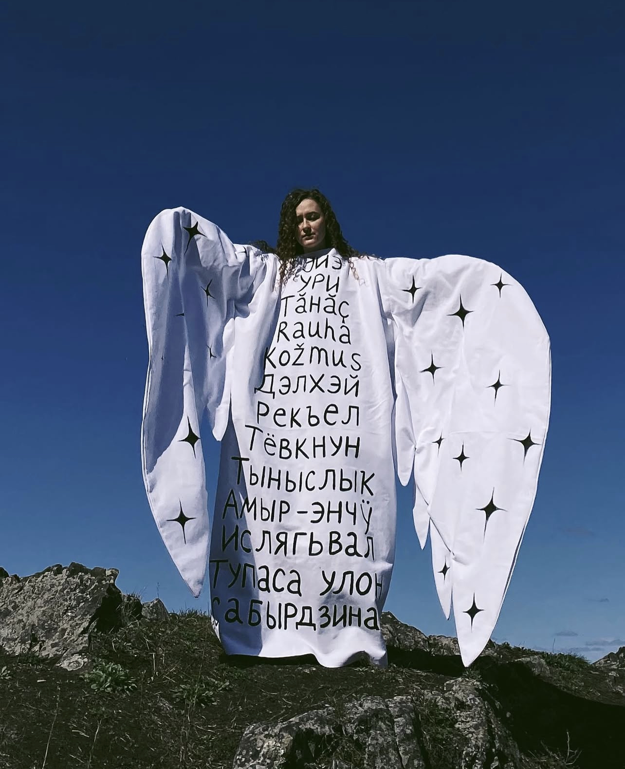 Затем художница создала серию работ, которые назвала "Слышу голоса России". Она смастерила костюмы и поместила на них слова "Мы против войны", "Мир" и "Боль" на языках разных народов России.