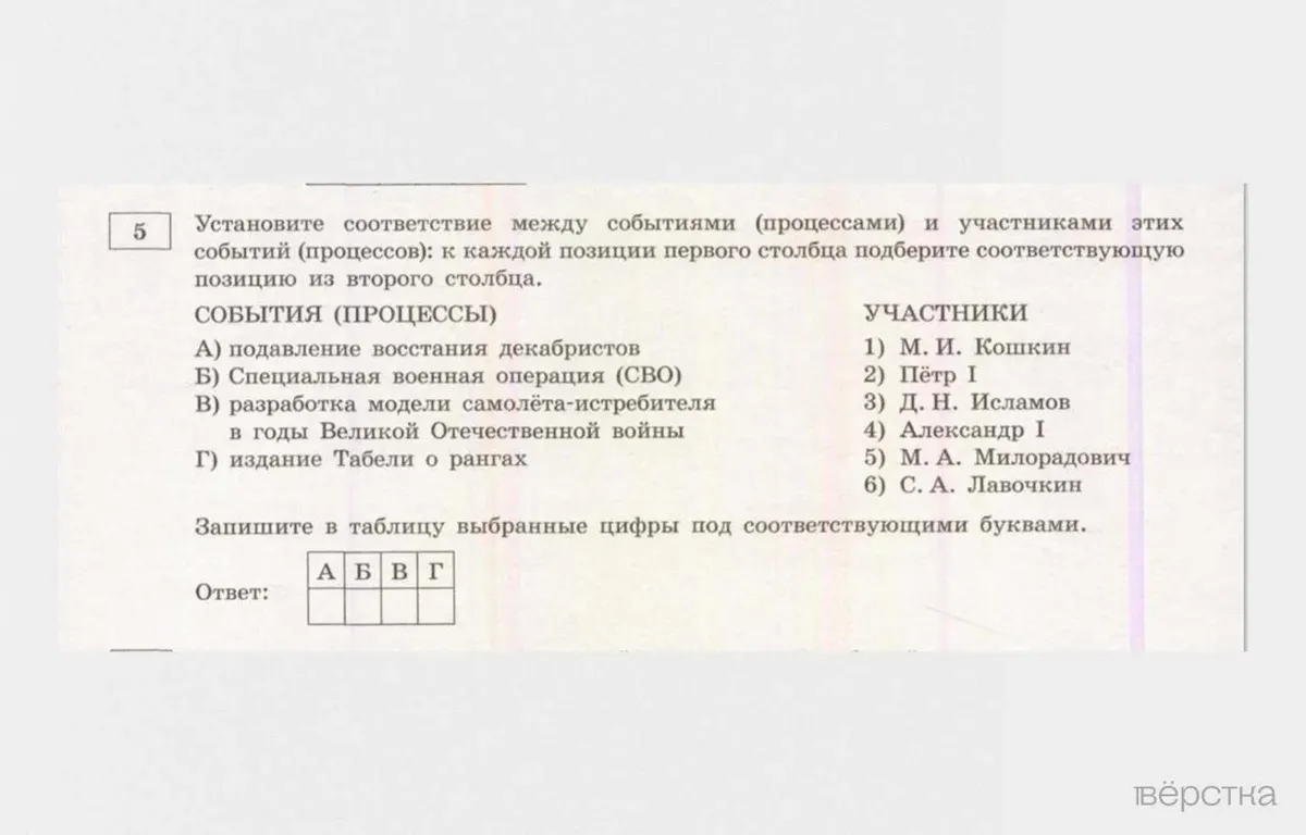 Имена росийских военных появляются в вопросе №5, в котором нужно соотнести исторические события с личностями, отмечает «Вёрстка». Среди указанных участников боевых действий — командир спецназа «Ахмат» Апти Алаудинов, командующий батальоном «Спарта» Владимир Жога, танкисты Дамир Исламов, Дамир Гилемханов и Иван Цевун, летчик-снайпер из ЧВК «Вагнер» Канамат Боташев, полковник Ольга Качура, десантники Нурмагомед Гаджимагомадов и Александр Жихарев, а также медики Александр Сеикаев и Мария Мирошниченко.